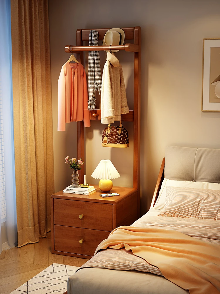 Solid Wood Ultra-Narrow Multifunctional Clothes Rack and Nightstand Combo - Perfect for Small Bedrooms, Featuring a Stylish Floor-mounted Design for Efficient Space Utilization!