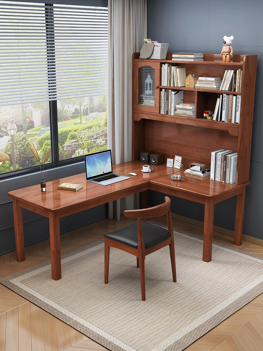 コーナー式天然木製デスク&本棚一体型、壁掛けL字型拡張パソコンデスク。家庭用・寝室向け、中小学生の学習に最適!快適な学習環境を提供します。