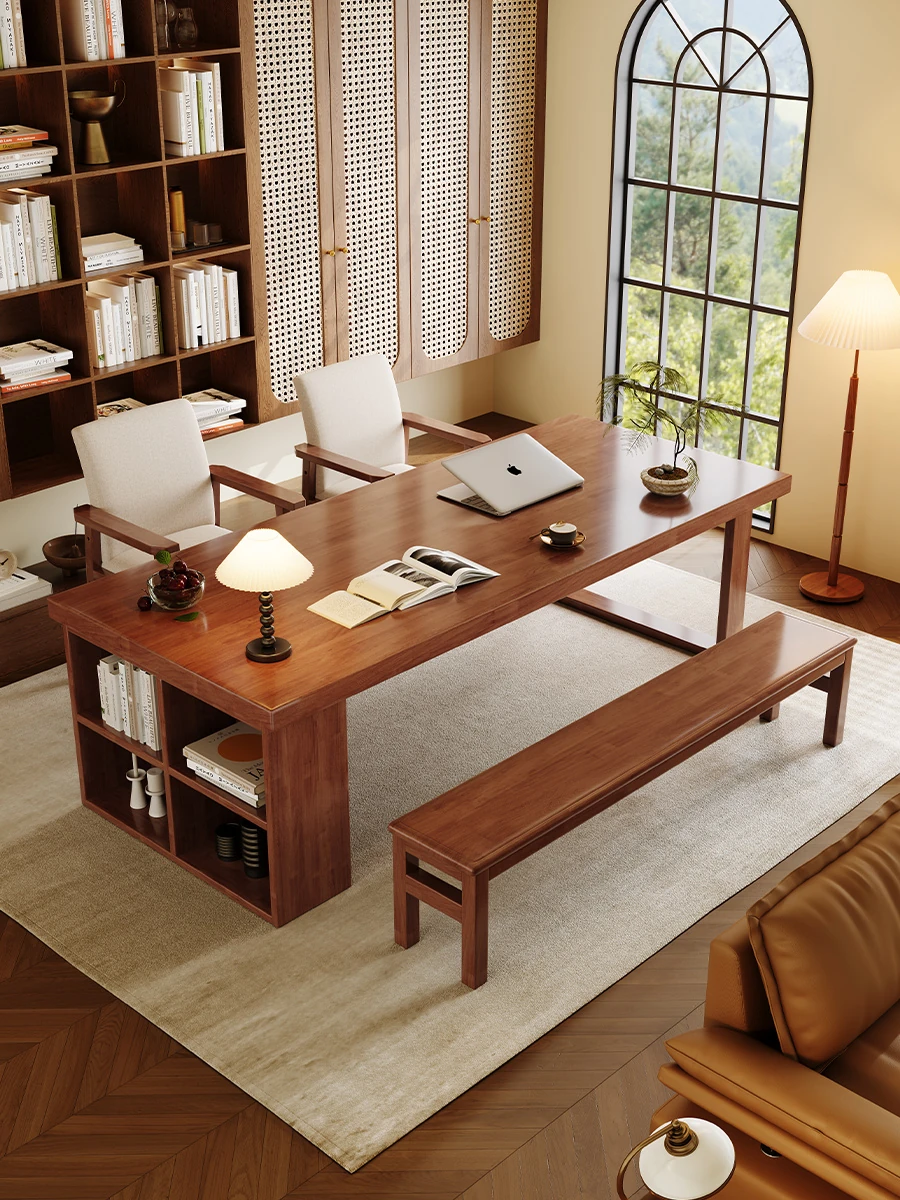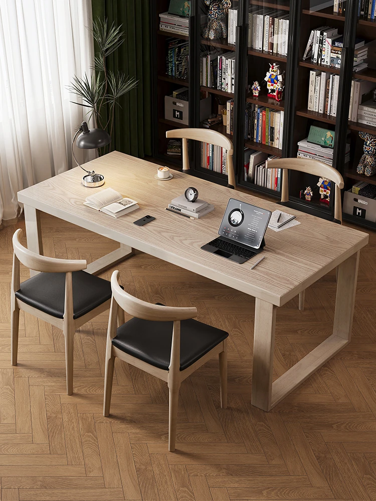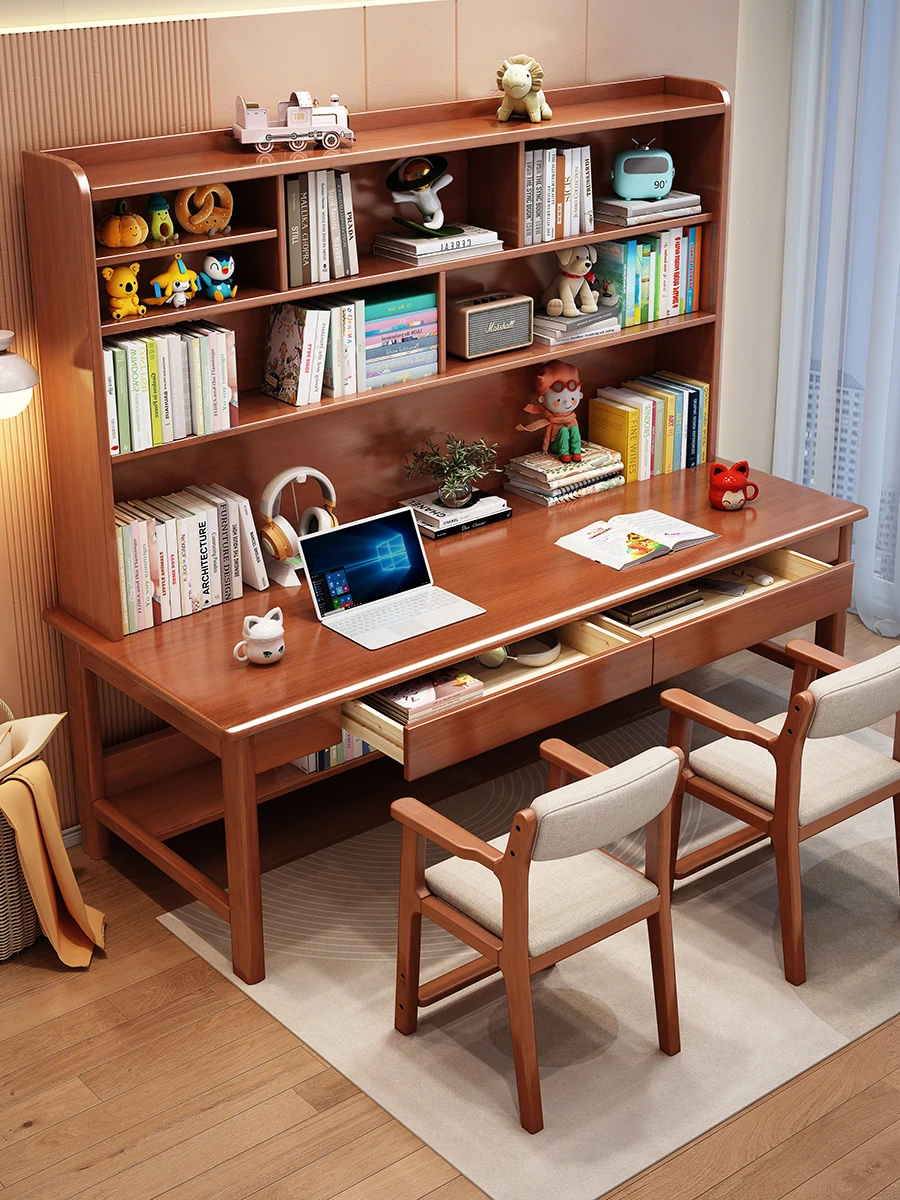 ダブルパーソン向けのシンプルな無垢材デスク&シェルフ一体型!スタイリッシュな長方形デザイン、書斎や寝室に最適。学生にもぴったりな学習デスクと椅子のセットで、快適な勉強環境を実現します!