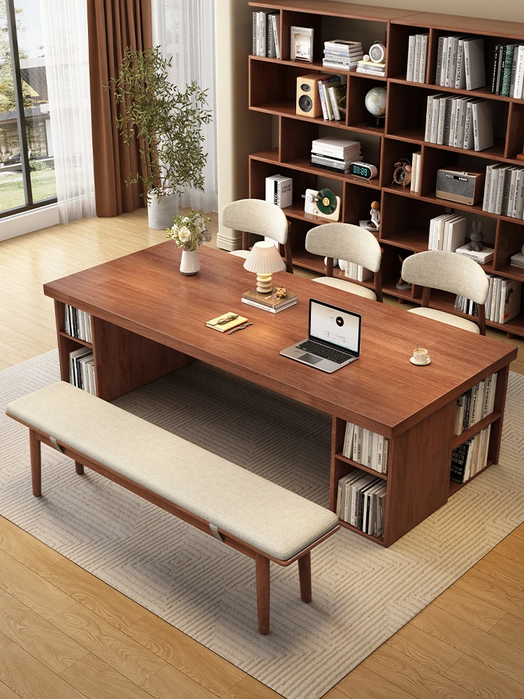 全木製の大きな書斎デスク 書棚付きコンビネーション リビングに最適!広々とした天板で読書や作業も快適に。多人数での使用にも対応した多機能なオフィスデスク。