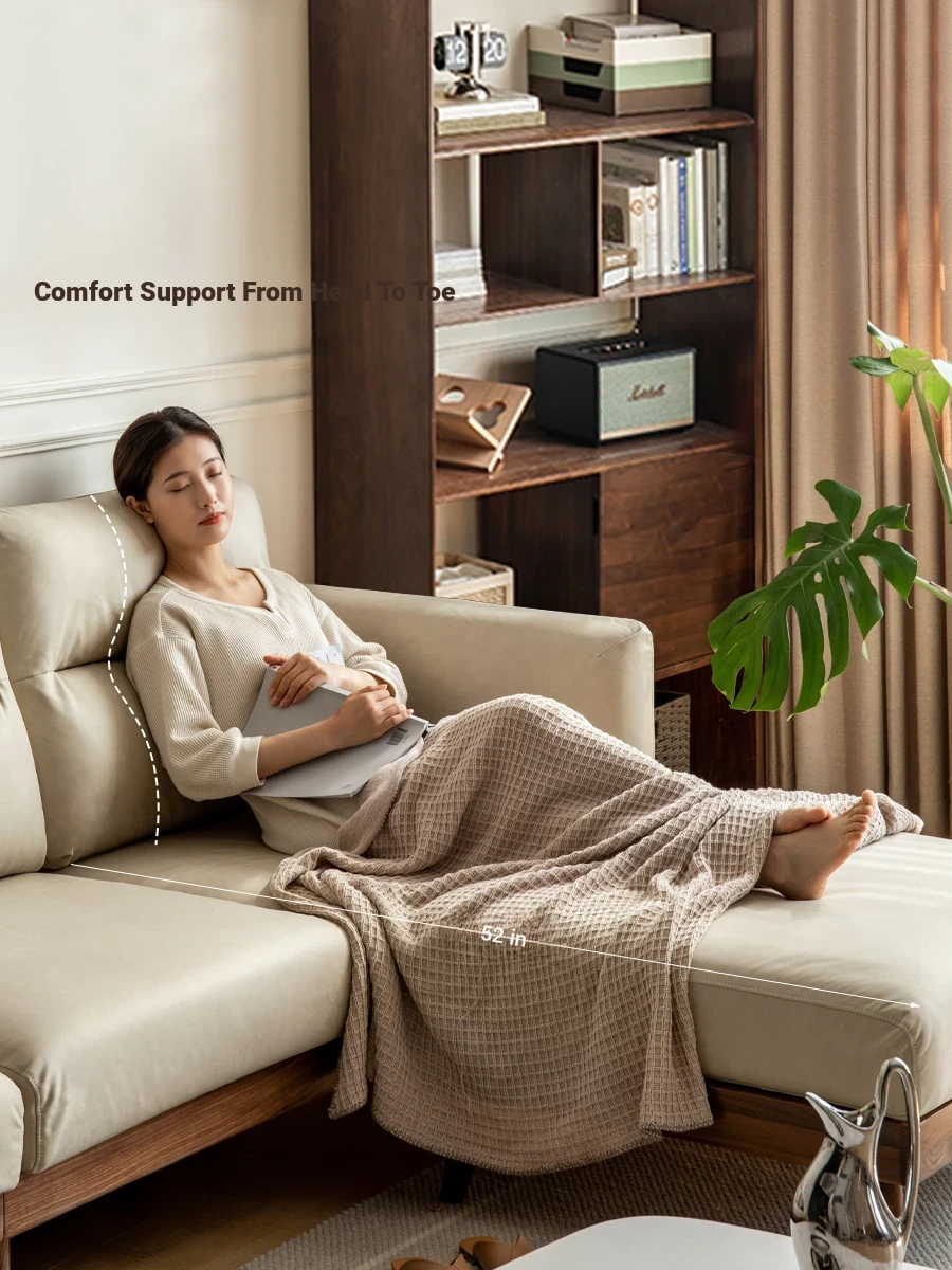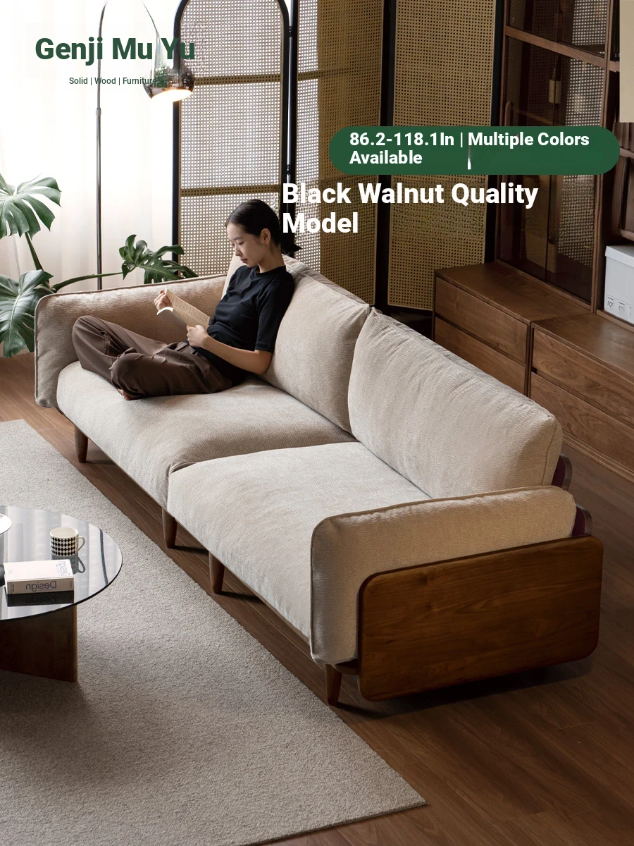Genji Mu Yu Solid Wood Sofa - Modern Minimalist Living Room Tech Fabric Couch in New Chinese Style, Walnut Wood Design for Home Comfort.