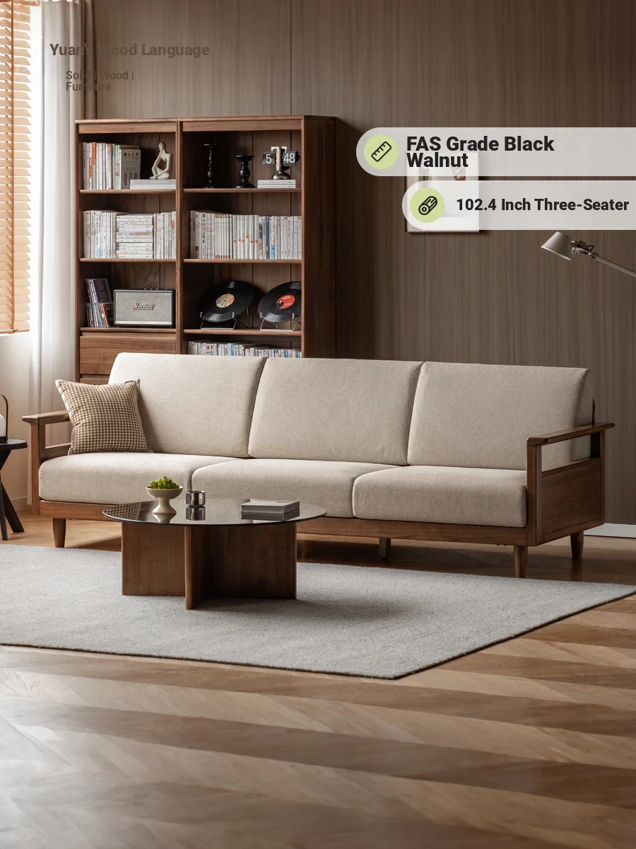 Genji Mu Yu Modern Minimalist Solid Wood Sofa - Elegant Three-Seat Fabric Sofa with Black Walnut Finish for Contemporary Living Rooms, New Chinese Style Design