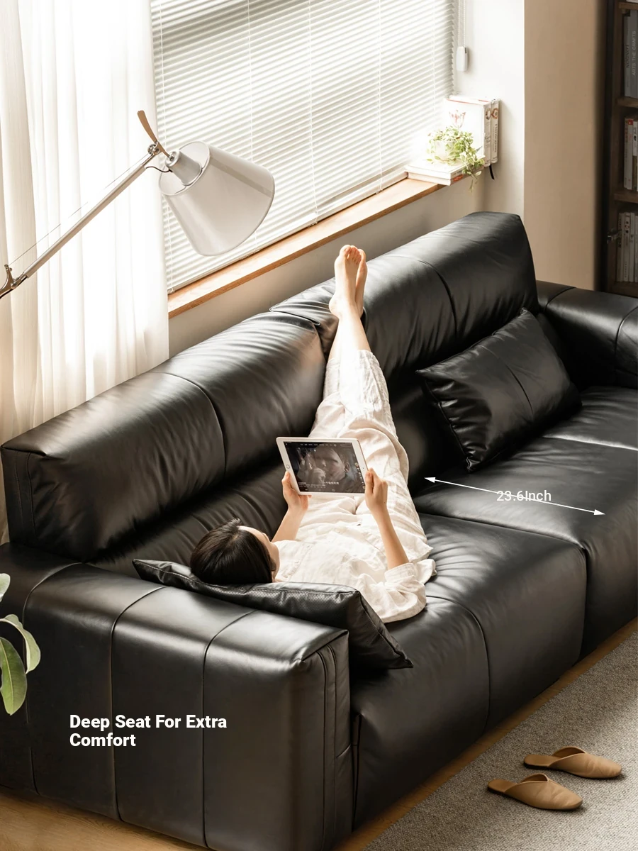 Genji Mu Yu Genuine Leather Sofa - Italian Minimalist Top-Grain Cowhide Down Sofa for Living Room, Black Home Use Straight Design. Perfect Blend of Comfort and Style!