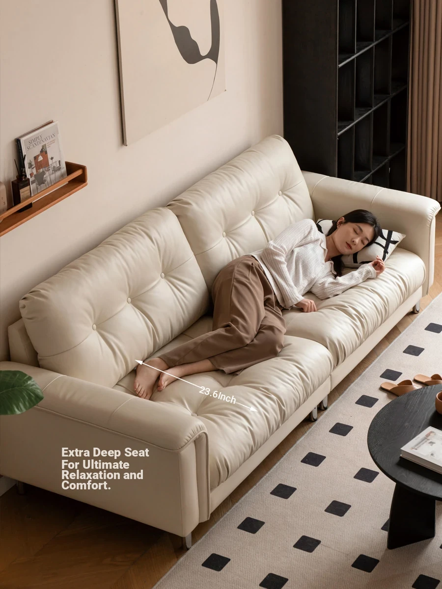 Genshin Wood Real Leather Sofa - Elegant Cream White Italian-Style Straight Sofa Made with Premium Top-Grain Cowhide for a Luxurious Living Room Experience