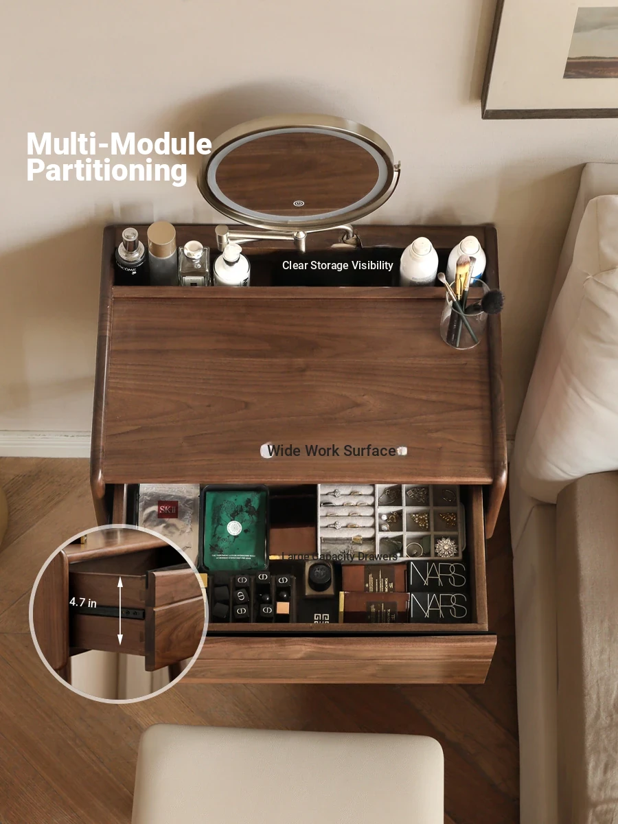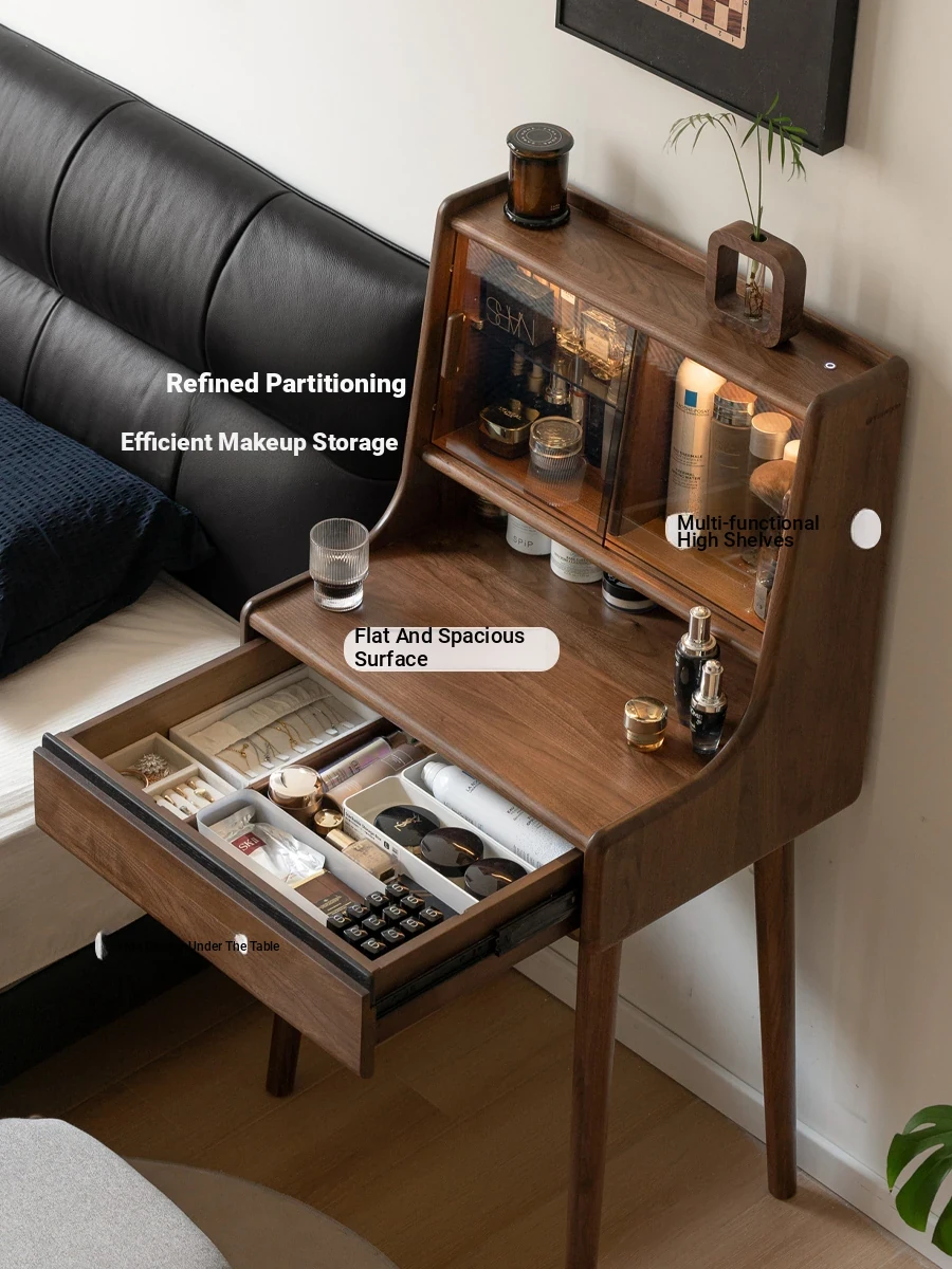 Genji Mu Yu Solid Wood Dressing Table & Desk Combo – Modern Black Walnut Makeup Table for Small Spaces with Built-in LED Light, Perfect for Your Bedroom!