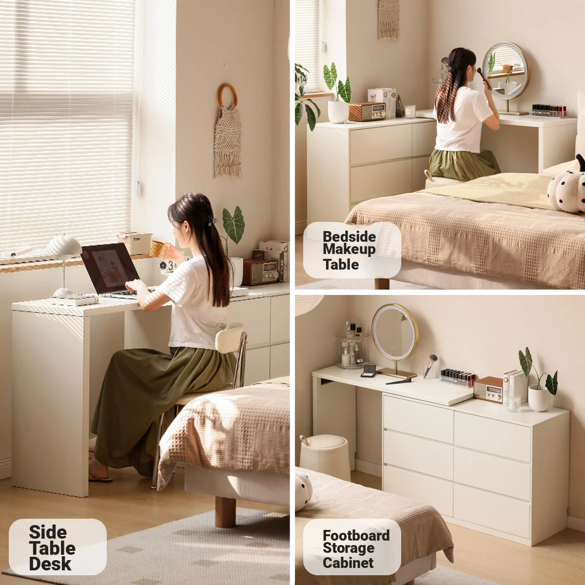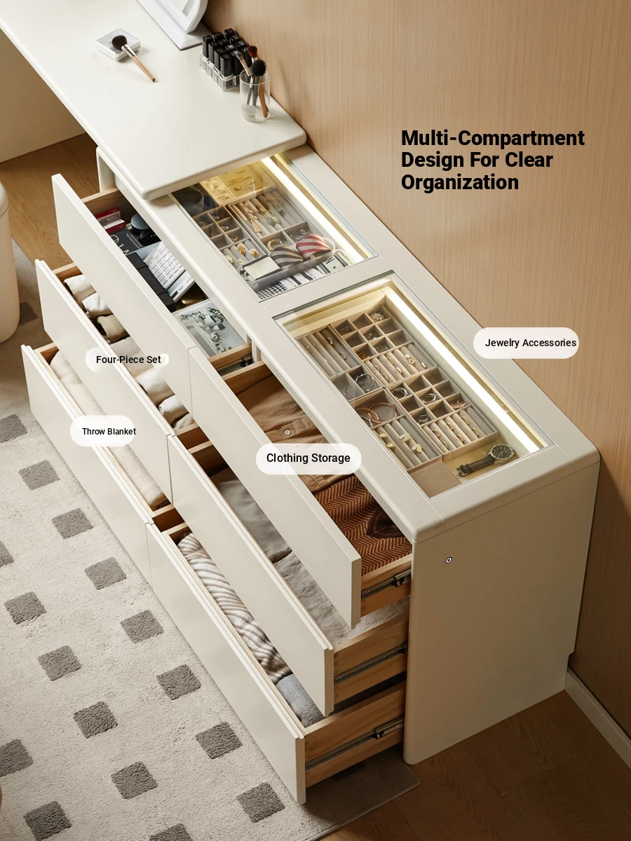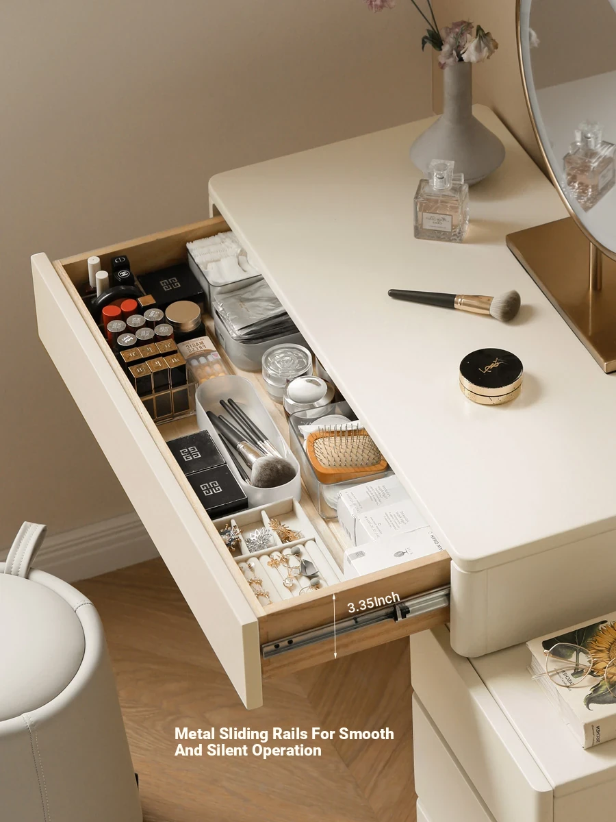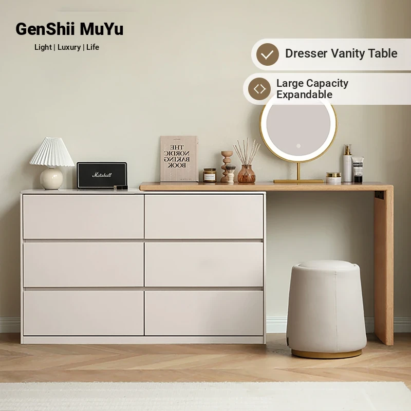 Genji Mu Yu Solid Wood Vanity Table - Modern Minimalist Bedroom Storage Cabinet, Creamy Multifunctional Expandable White Makeup Desk