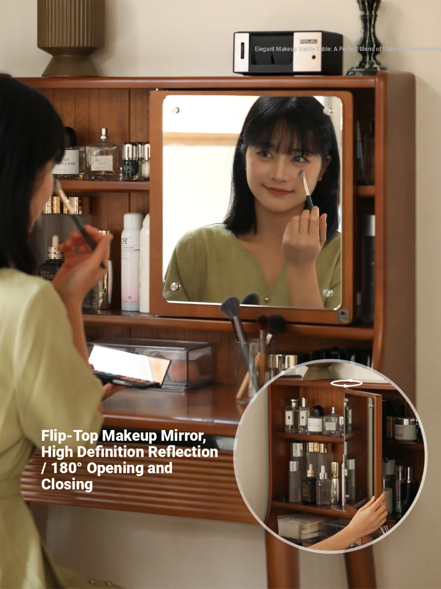 Genji Wood French Vintage Solid Wood Makeup Vanity with Mirror Shelf - Elegant Mid-Century Dressing Table for Bedroom Storage Solutions
