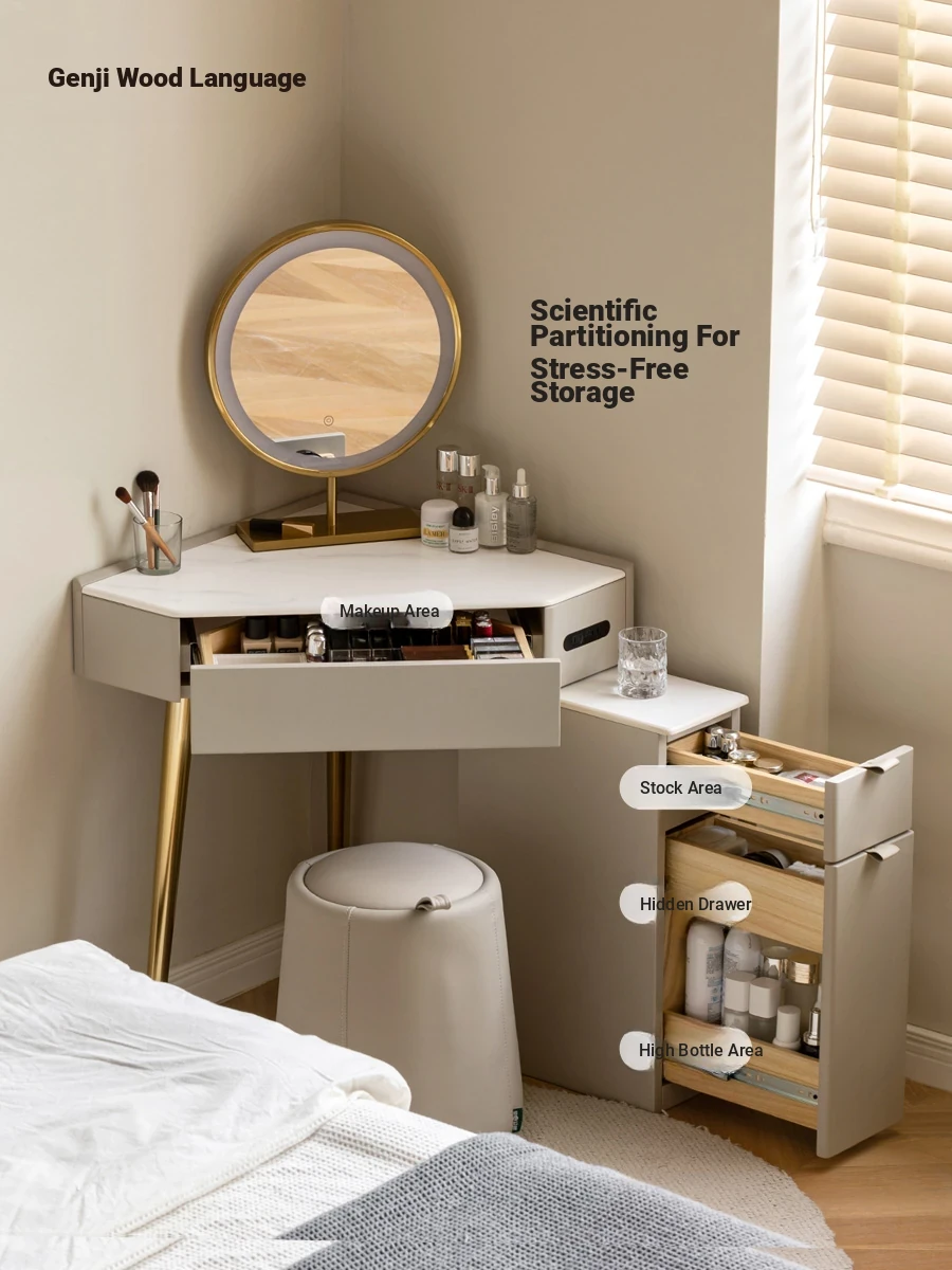 Genji Mu Yu Solid Wood Vanity Table – Elegant Corner Dressing Table for Small Spaces, Minimalist Gray Storage Cabinet for Bedroom
