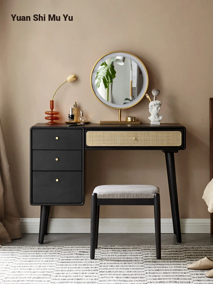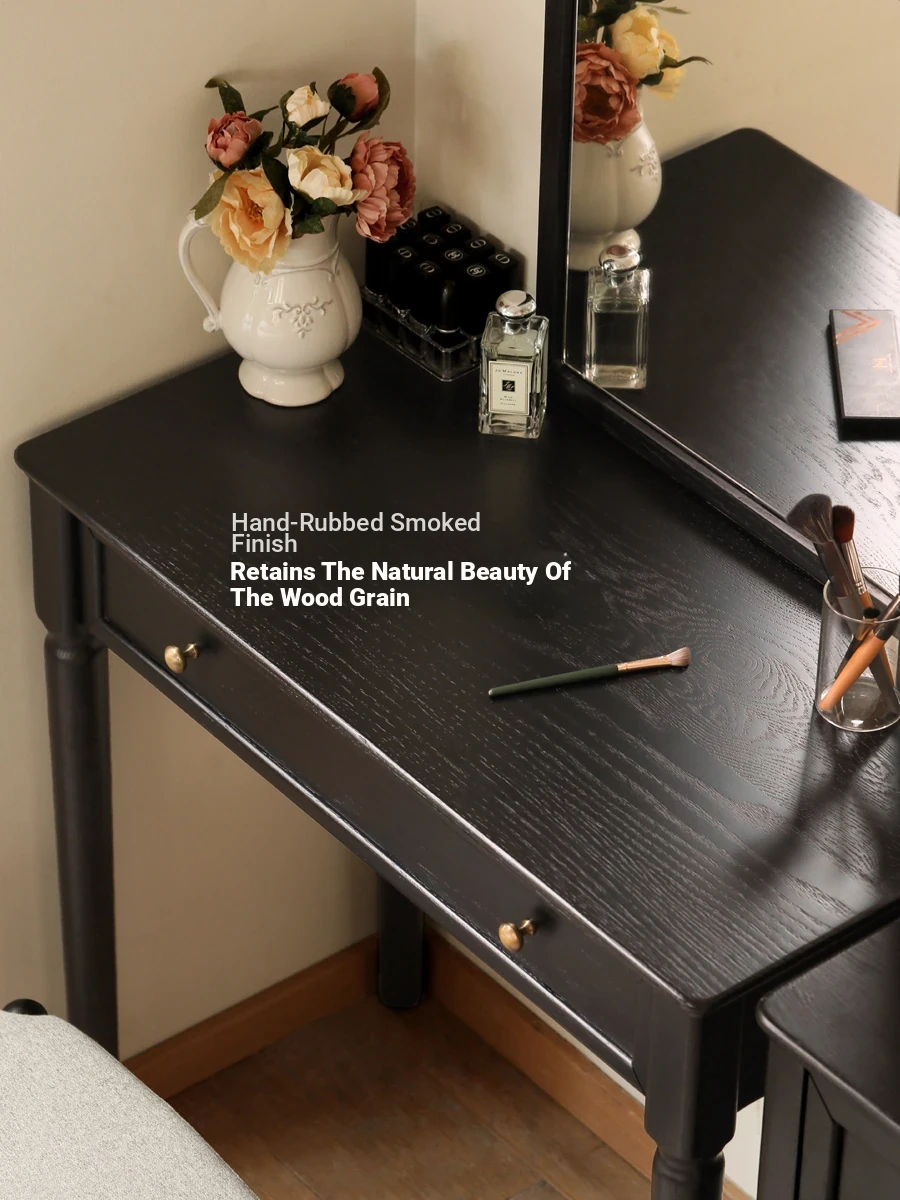 Genji MuYu Solid Wood Vanity Table - Black American Vintage Makeup Desk with Integrated Mirror in Oak Finish - Elevate Your Beauty Routine in Style!