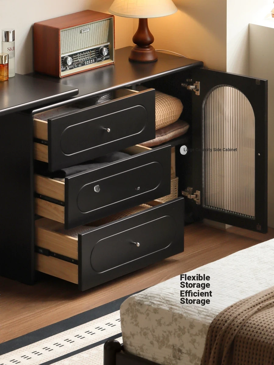 Genji Mu Yu French Vintage Black Makeup Vanity with Integrated Dresser – Elegant Wooden Dressing Table for Your Bedroom, Stylish and Space-Saving Design.