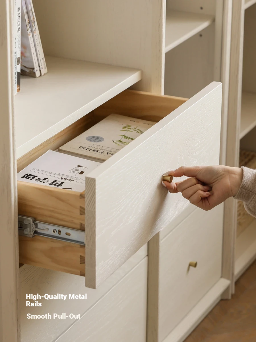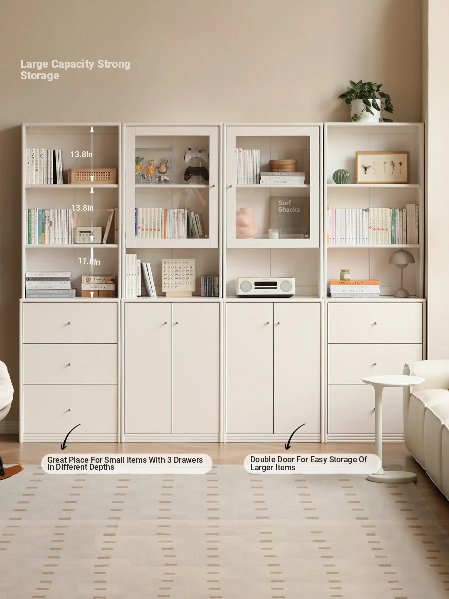 Genji Muyu Solid Wood Modular Bookshelf with Integrated Full Wall Design, Glass Door, Floor-to-Ceiling Bookshelf - Creamy White Storage Cabinet for Elegant Home Décor