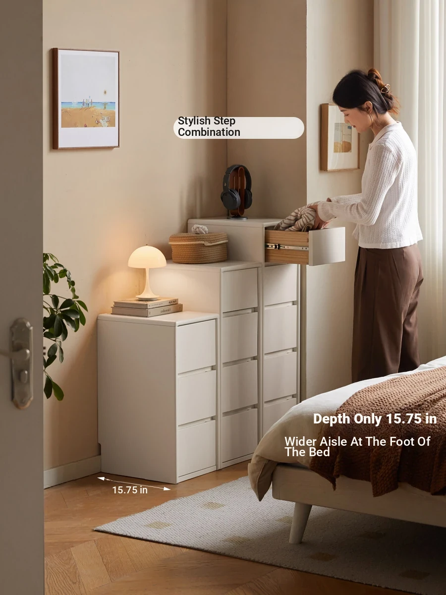 Genji Mu Yu Solid Wood Narrow Chest of Drawers - Modern Minimalist Cream-Colored Storage Cabinet with White Drawers for Home Use, Perfect for Space-Saving Solutions.