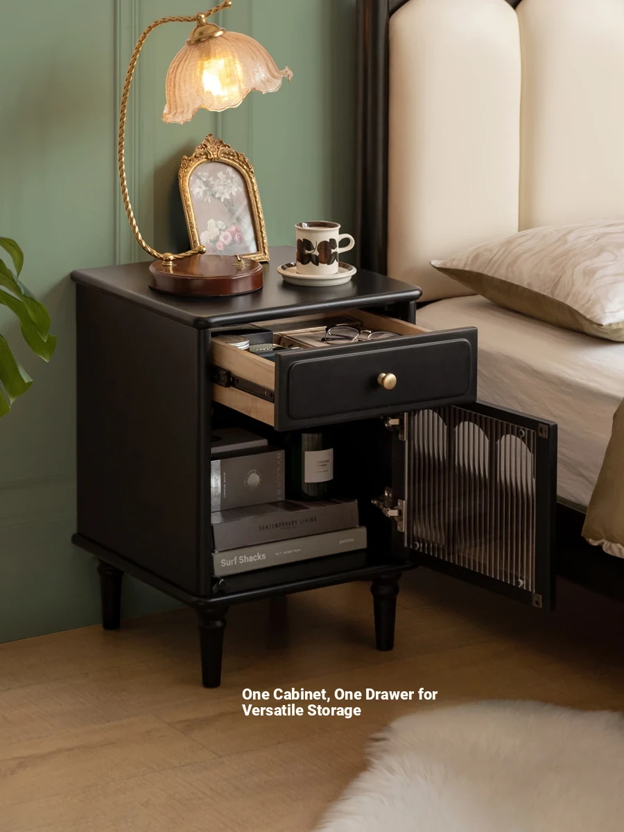 Genji Wooden French Vintage Solid Wood Nightstand - Elegant Black Bedside Cabinet for Bedroom Storage - Stylish Space-Saving Solution for Your Home