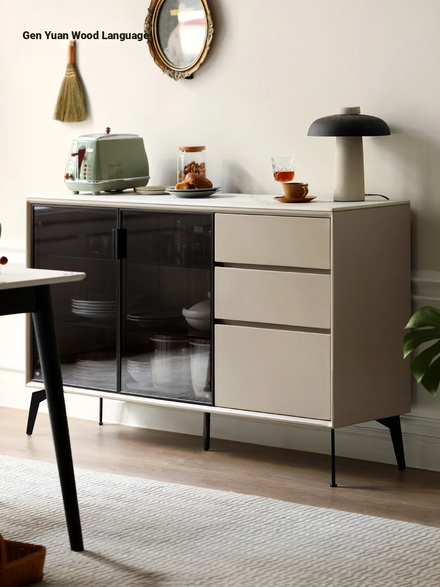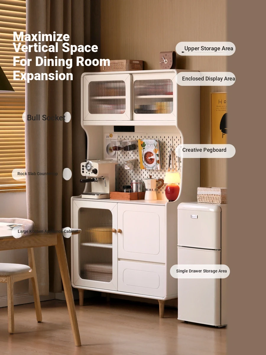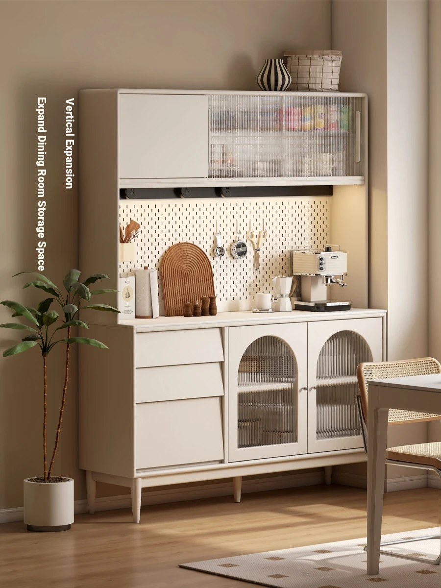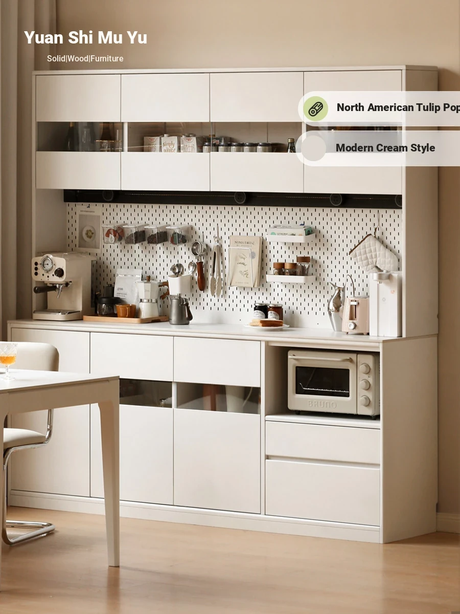 Genji Woodcraft Solid Wood Sideboard Cabinet - Wall-Mounted All-in-One High Storage Unit, White Cream Style, Featuring Rock Panel Design for Tea and Beverage Storage.