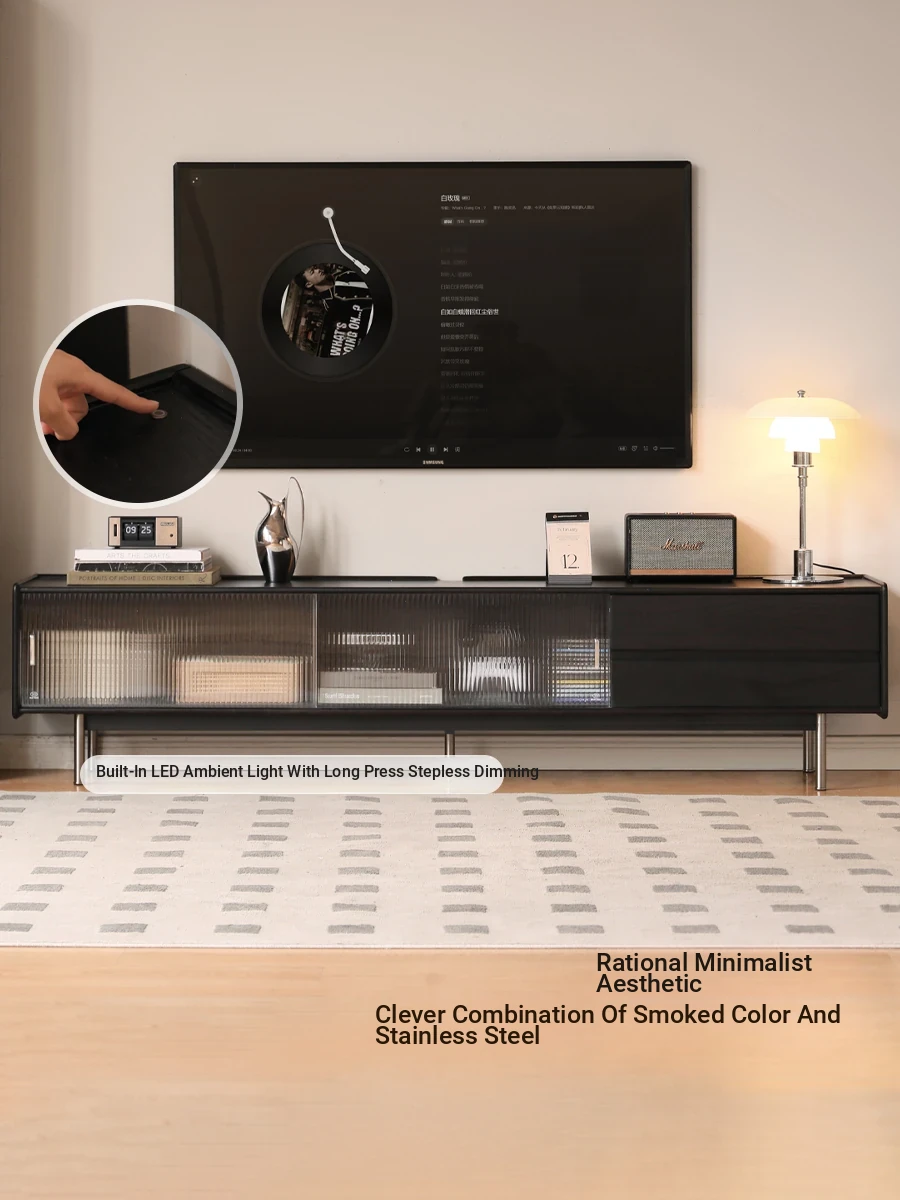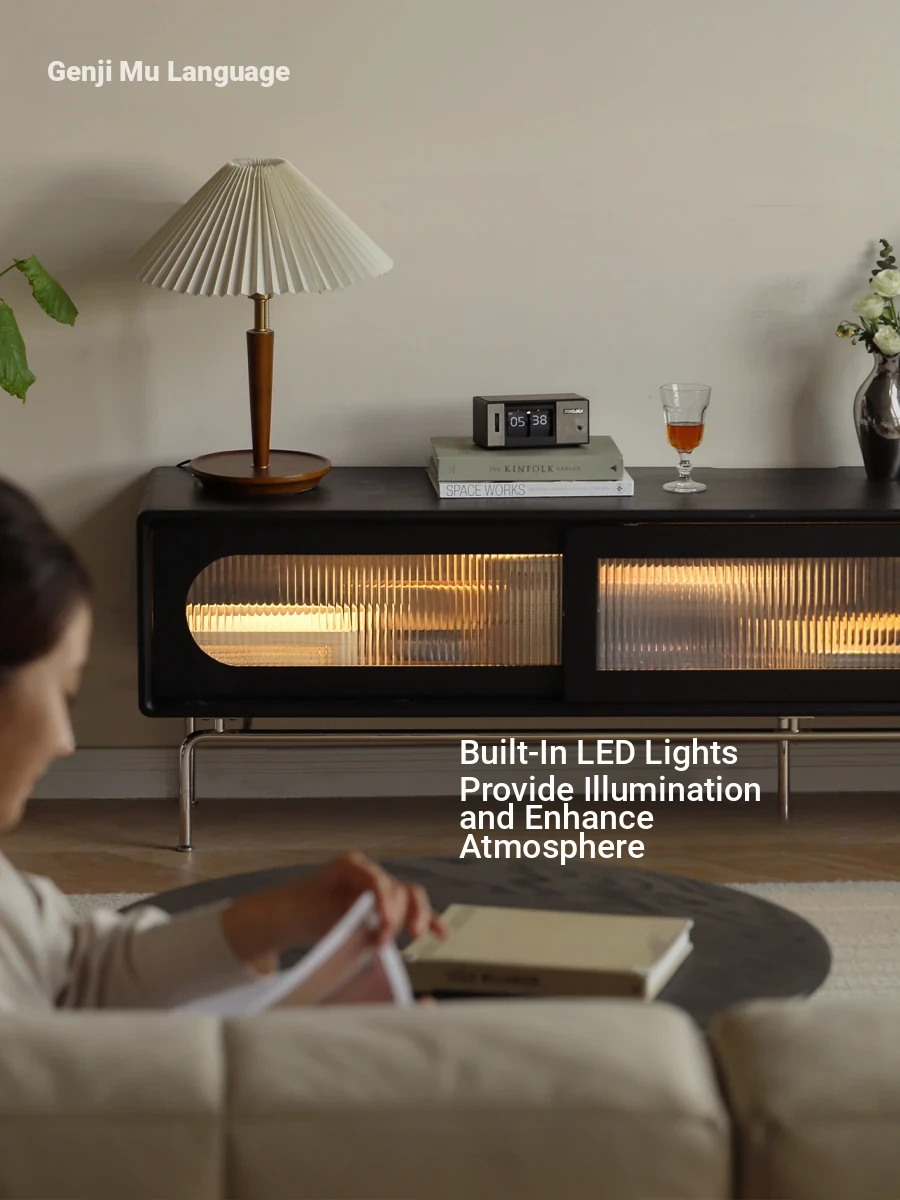 Genji Mu Yu Solid Wood TV Cabinet - Stylish Minimalist Storage Unit for Living Room, French Retro Design with Black Glass Sliding Doors, Perfect for Home Décor and Organization