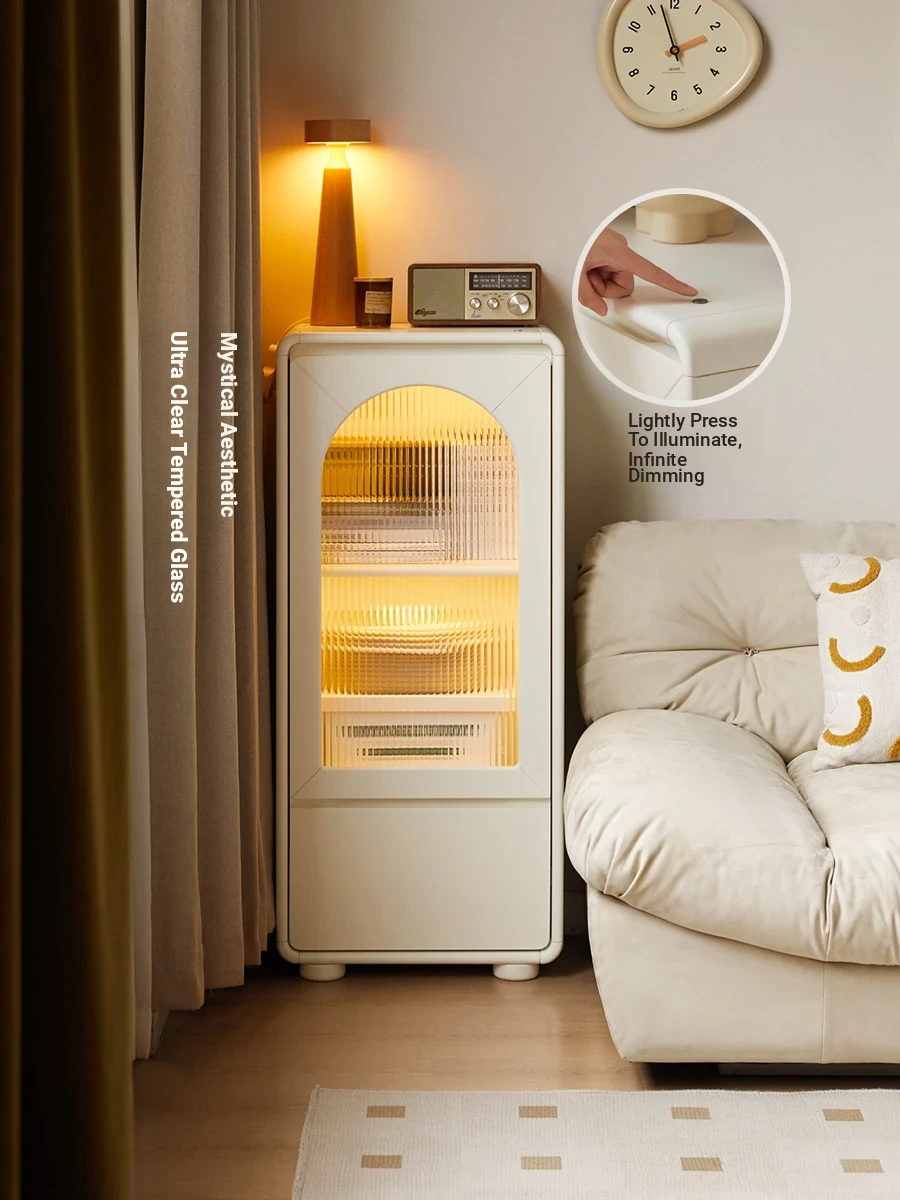 Genji Wood Solid Wood Nightstand - Mobile White Bedside Cabinet with LED Light, Cream Style Small Storage Unit for Bedroom