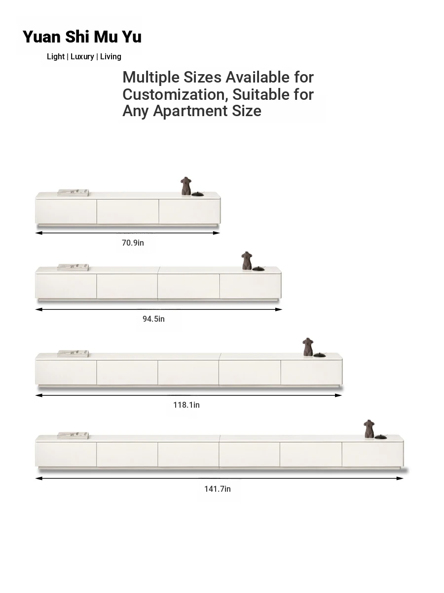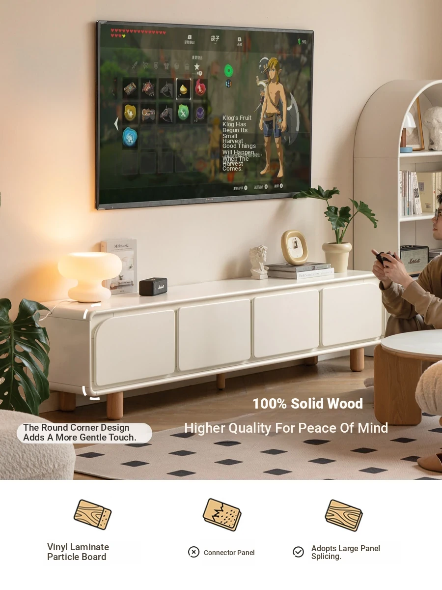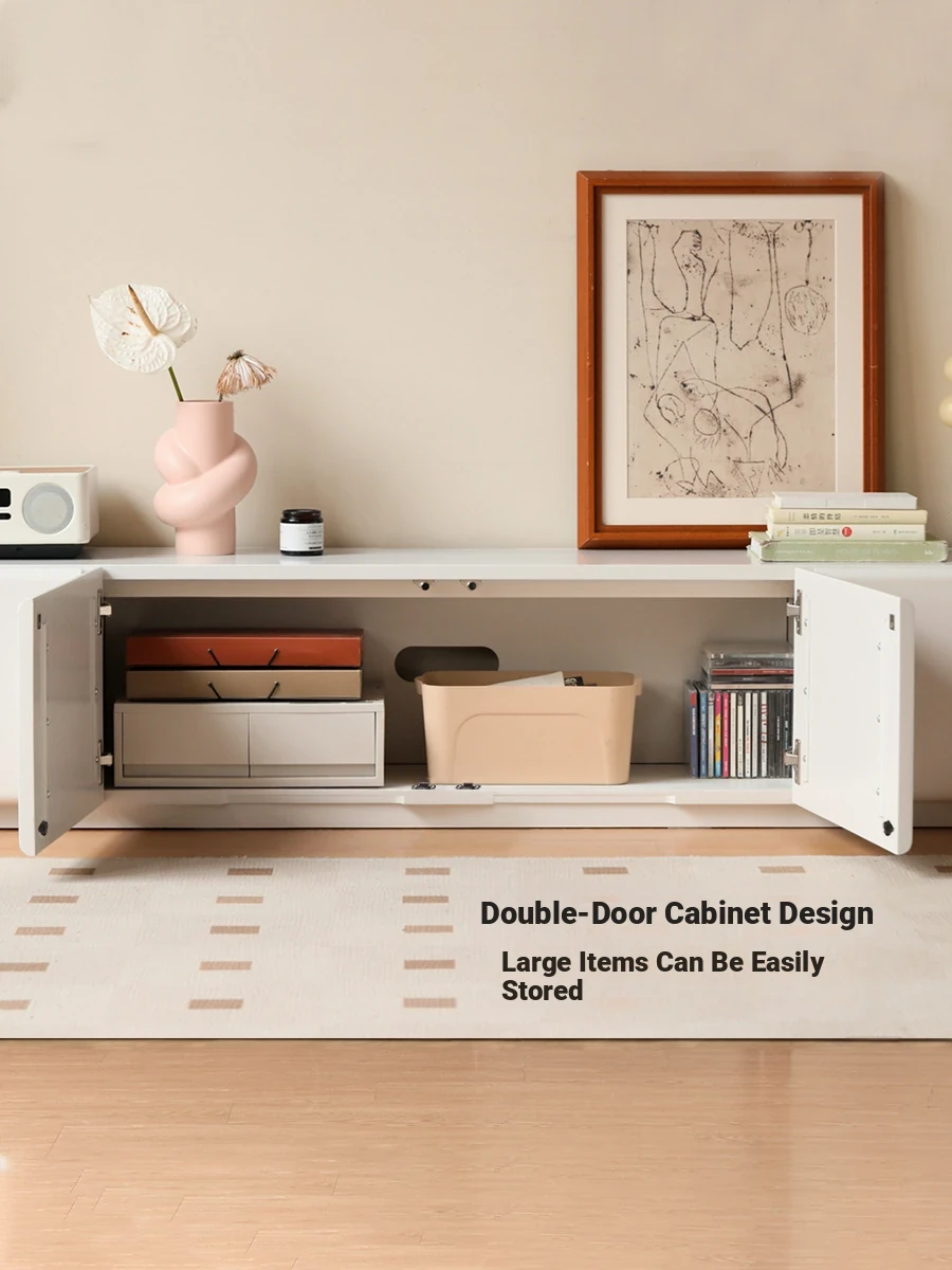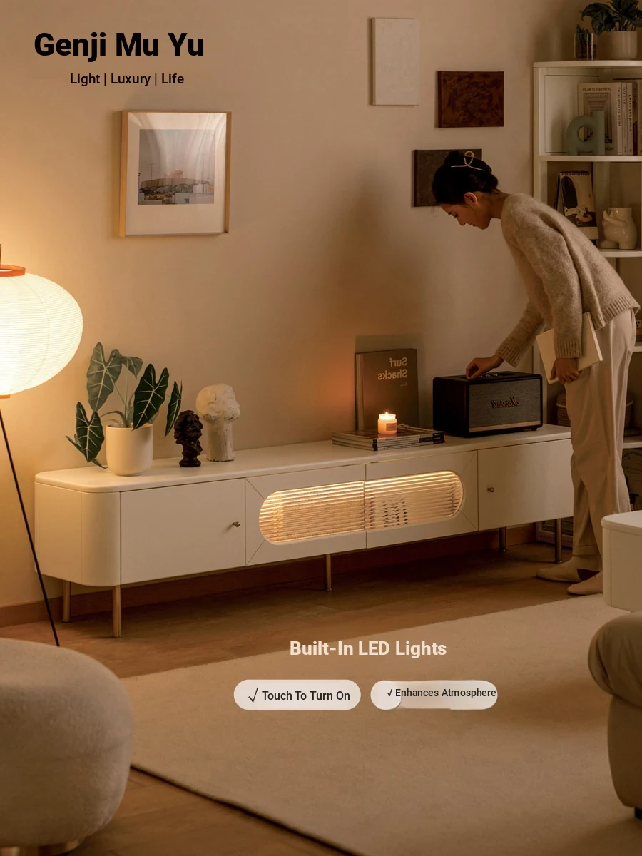 Genji Mu Yu Solid Wood Cream Rock Panel TV Cabinet – Modern Minimalist Storage Unit for Small Living Rooms, Elegant White Design with Multi-Purpose Functionality