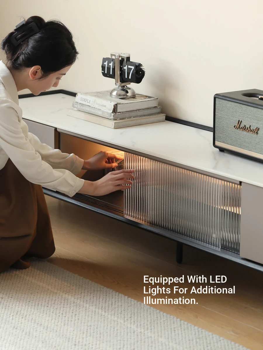 Genji Wood Minimalist Solid Wood Sideboard Cabinet with Elegant Stone Surface - Versatile Storage Solution for Home, Featuring Stylish Pegboard Design and Compact High Storage Space.