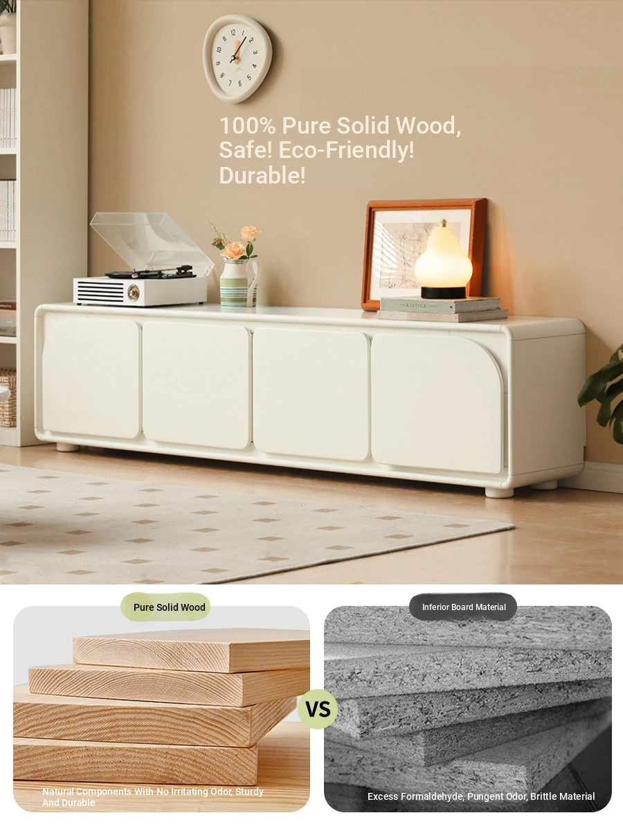 Genji Mu Yu Solid Wood TV Cabinet – Creamy White Floor Storage Unit for Small Living Rooms, Stylish and Functional Low Cabinet for Home Use