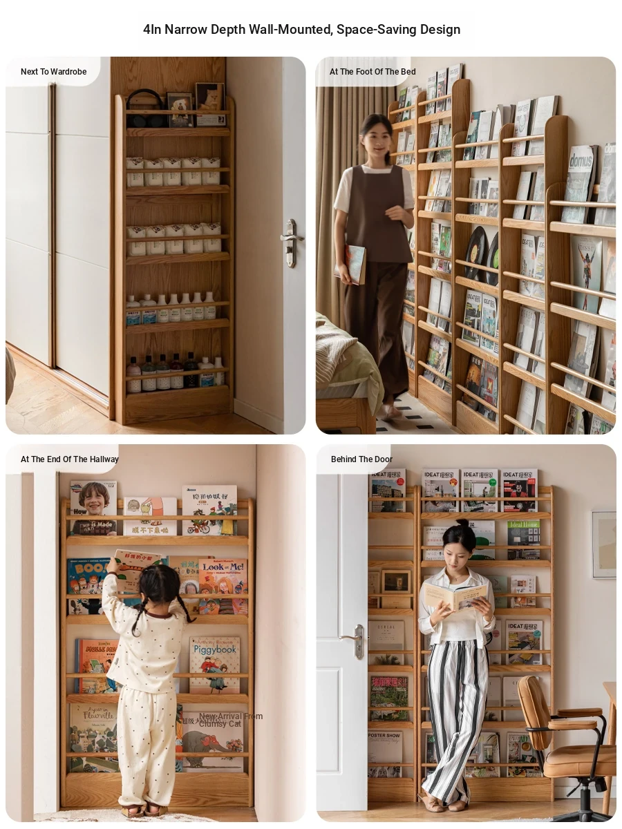 Genji Wooden Bookshelf - Modern Minimalist Solid Wood Floor Bookshelf for Home Office, Slim Oak Wall-Mounted Storage Rack for Books and Magazines