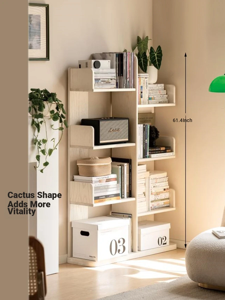 Genji Wood Solid Wood Bookshelf - Creamy White Cactus Corner Storage Rack for Home, Stylish Floorstanding Display Cabinet and Bookcase. Perfect for Organizing Books and Decor in Any Space!