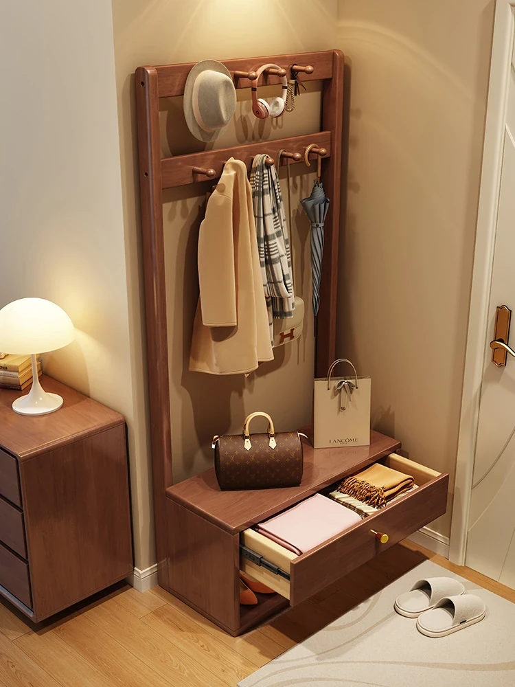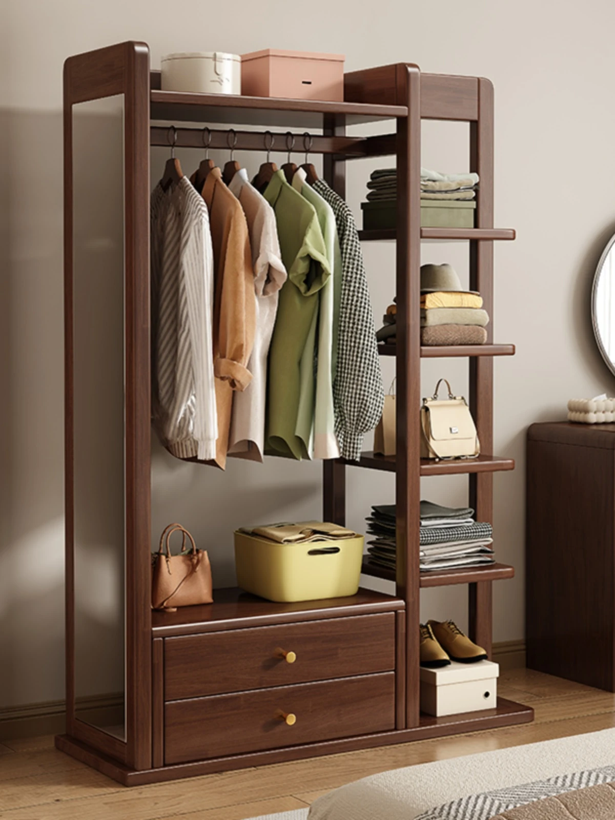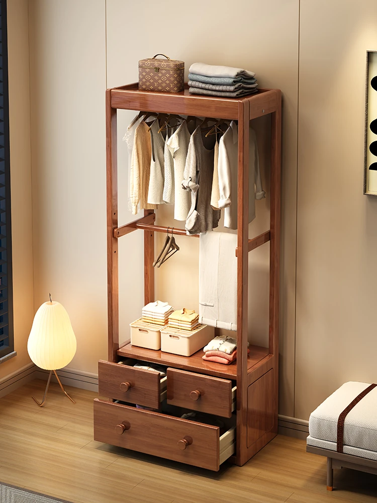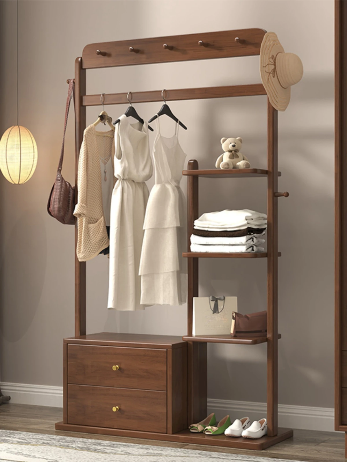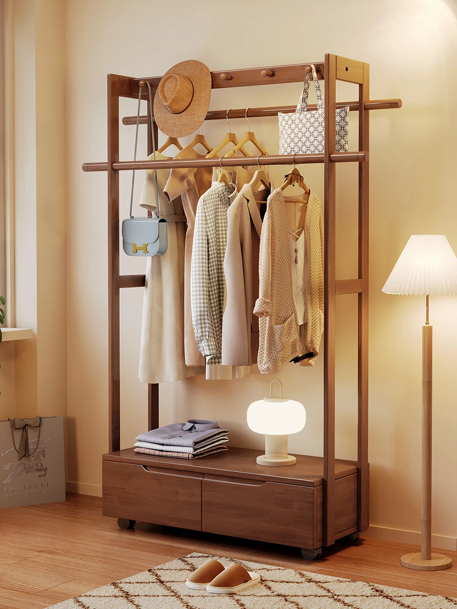 Solid Wood Coat Rack with Drawer - Modern Minimalist Freestanding Clothes Hanger and Wardrobe Storage Cabinet for Bedroom