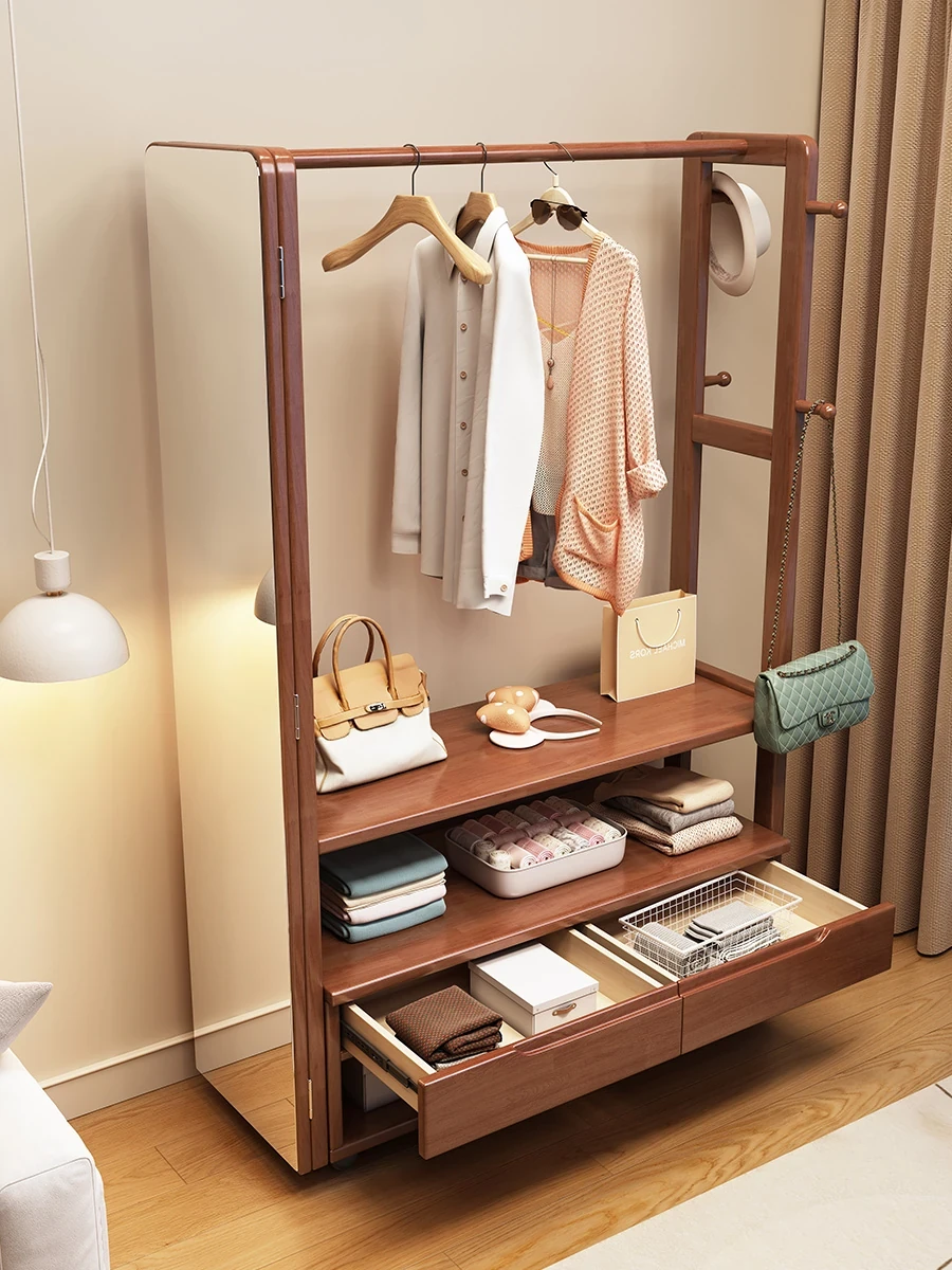 Stylish Multi-Functional Solid Wood Clothing Rack with Folding Floor Mirror - Ideal for Bedroom Storage and Outfit Display, Perfect for Organizing Clothes and Accessories.