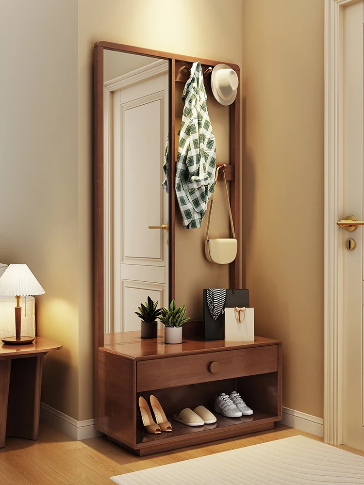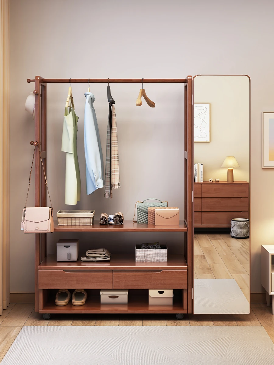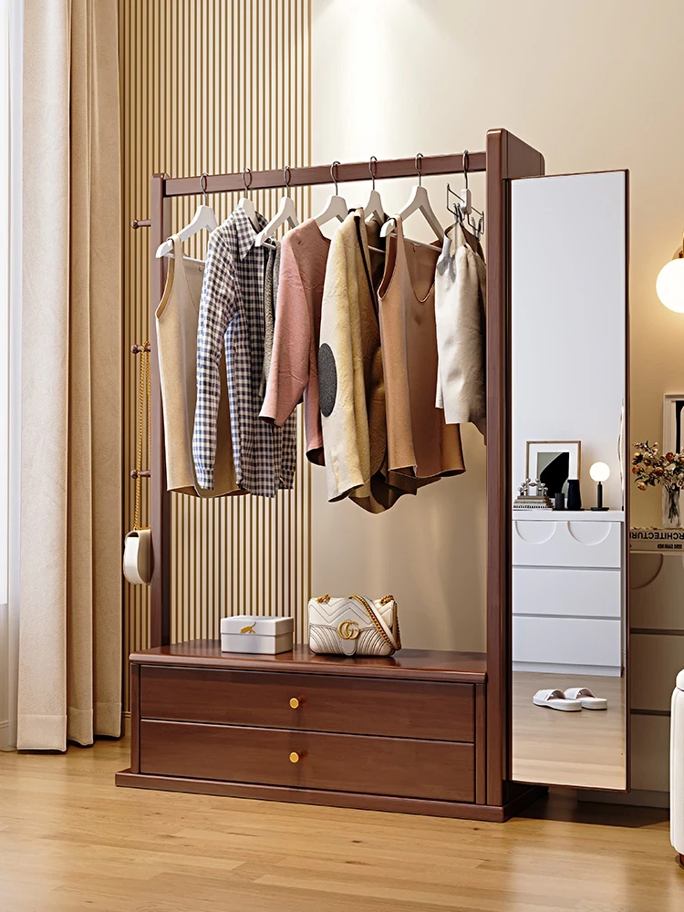 **Multifunctional Solid Wood Floor Coat Rack with Built-in Dressing Mirror - Stylish Wardrobe Storage Solution for Bedroom**