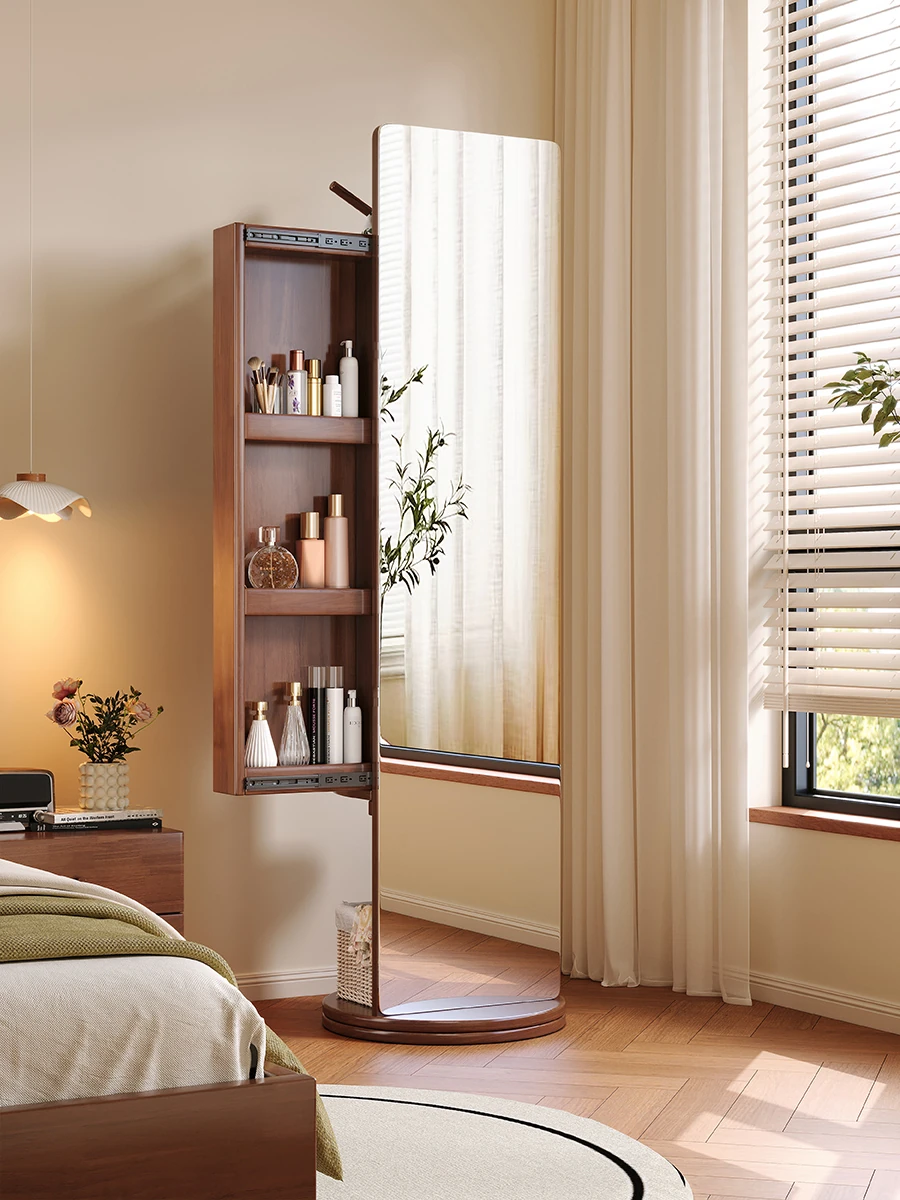 Rotating Solid Wood Floor Mirror with Built-in Makeup Table and Coat Rack – A Stylish Space-Saving Solution for Small Homes, Perfect for Effortless Organization and Chic Décor!