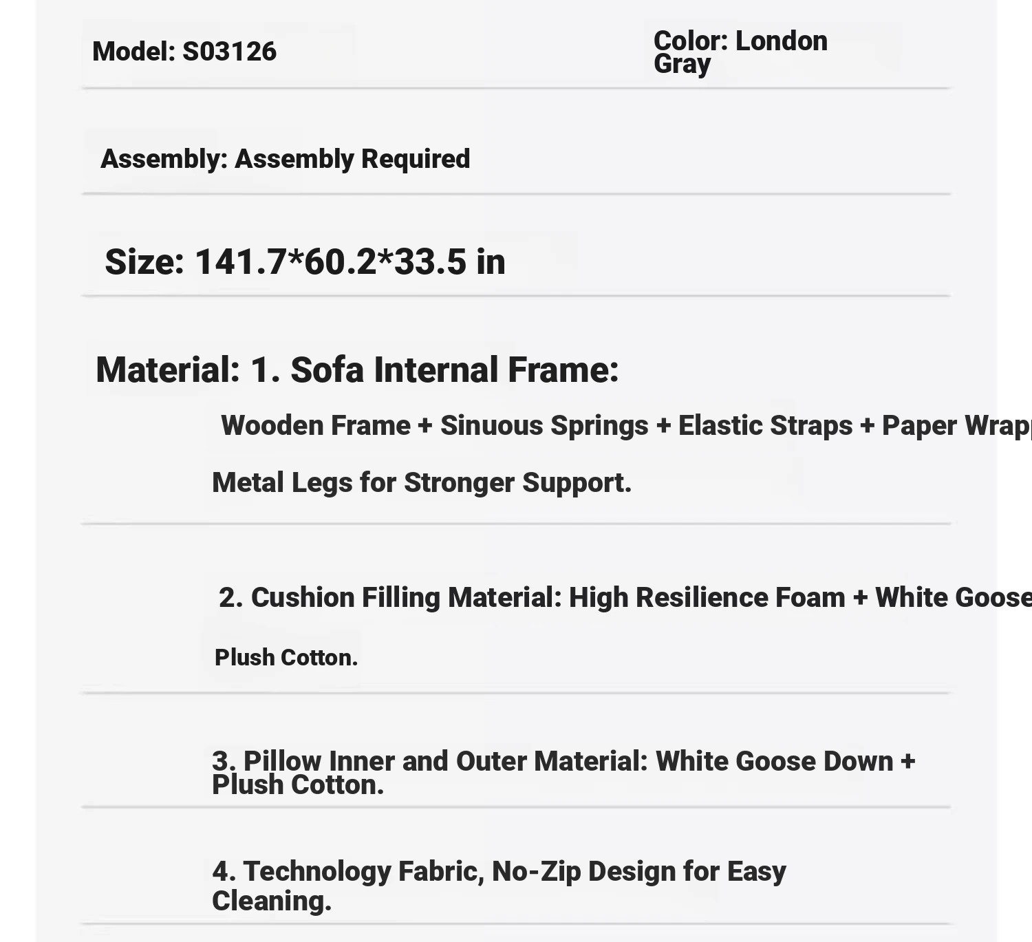 S03126 Sofa (Four) London Grey (Three Preventions)(141.73in*60.24in*33.46in)