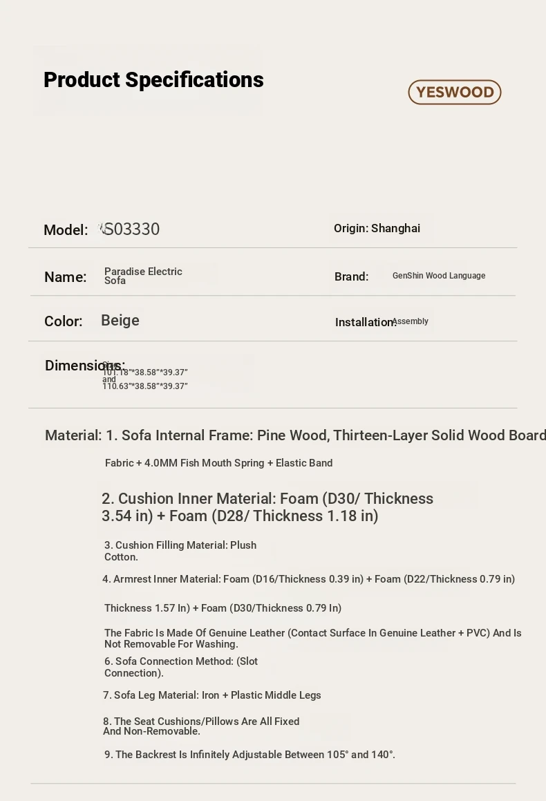 101.18 in right Electric (leather rice White)(101.18in*38.58in*39.37in)S03330