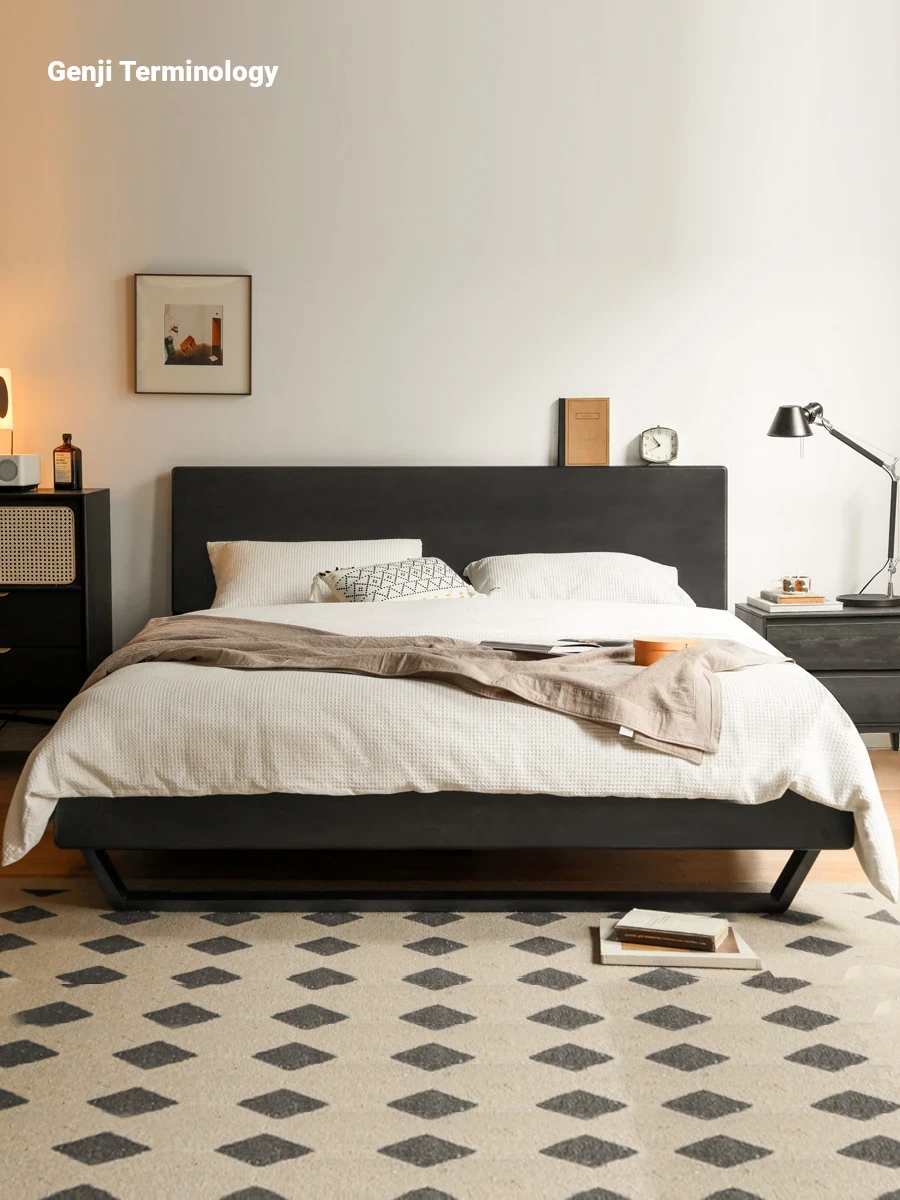 Genji Wood Black Solid Wood Bed - Modern Minimalist Oak Double Bed for Small Spaces, Nordic Style Master Bedroom Furniture