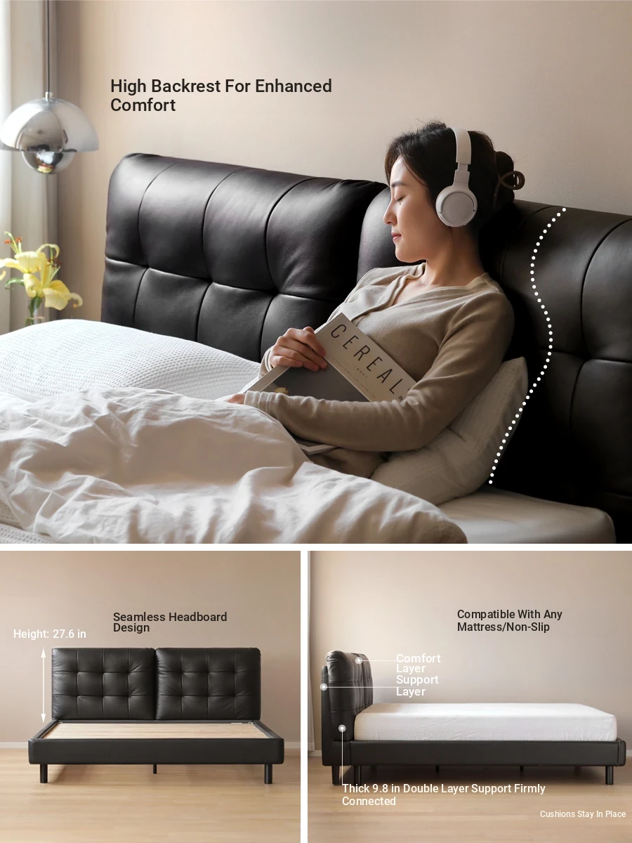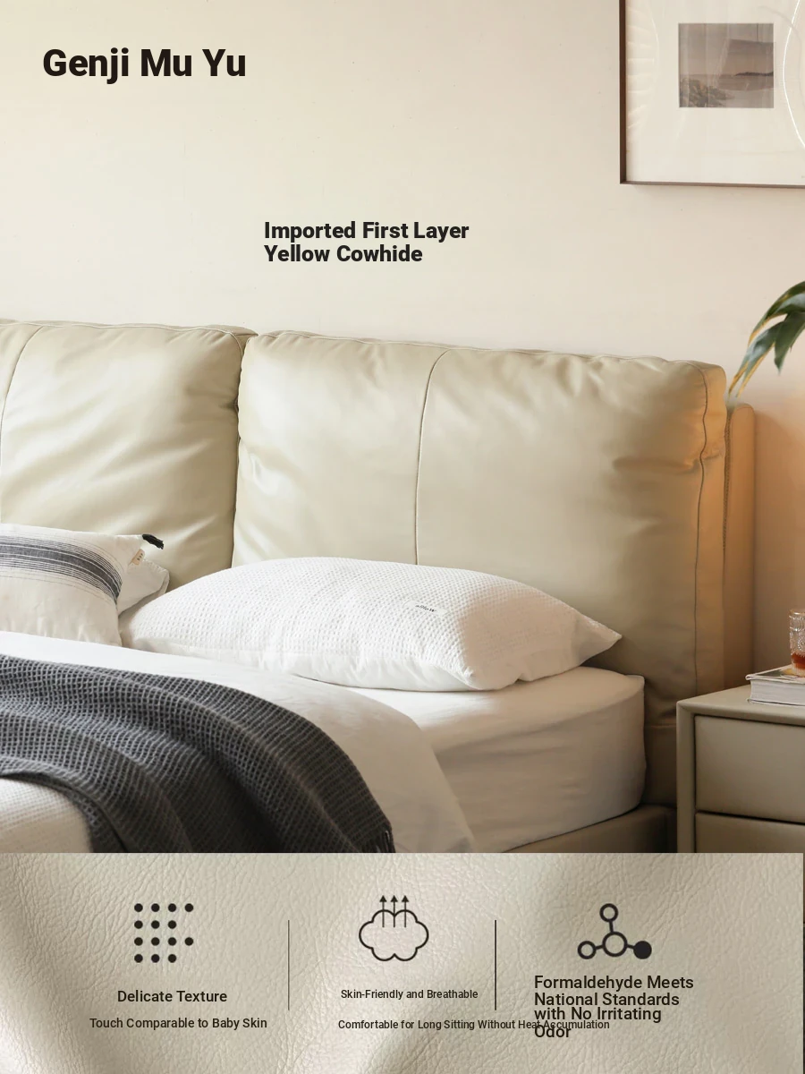 "Genji Mu Yu Genuine Leather Upholstered Double Bed - Modern Minimalist Design, Disturbance-Free Comfort for Your Master Bedroom, Made with Top Layer Cowhide"