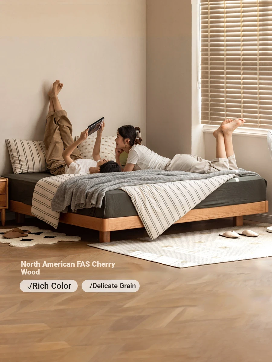 GenShi MuYu Solid Wood Bed - Cherry Wood Tatami Style Double Bed without Headboard for Small Spaces, Sleek Edge Floating Design, Perfect for Modern Bedrooms