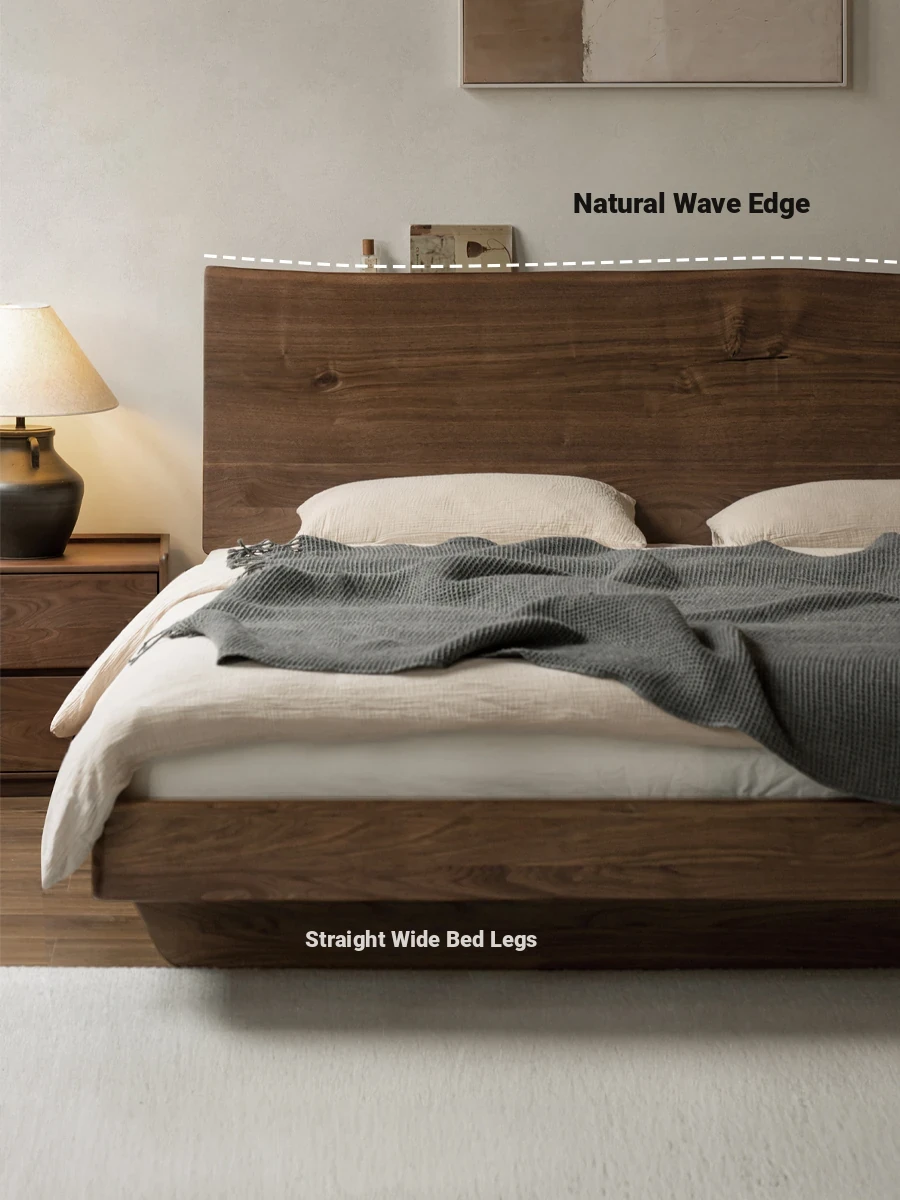 Genji Wood Simple Style Solid Wood Bed - Rustic Black Walnut Double Bed with Natural Edge for Cozy Bedrooms - Embrace Minimalist Elegance in Your Home