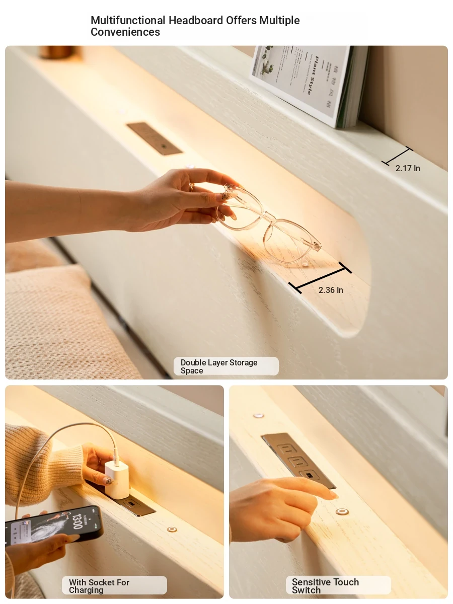Genji Muyu Solid Wood Bed – Creamy Oak Double Bed with Rechargeable Floating Feature, Modern Minimalist Design, White Night Glow – Perfect for Stylish Bedrooms!