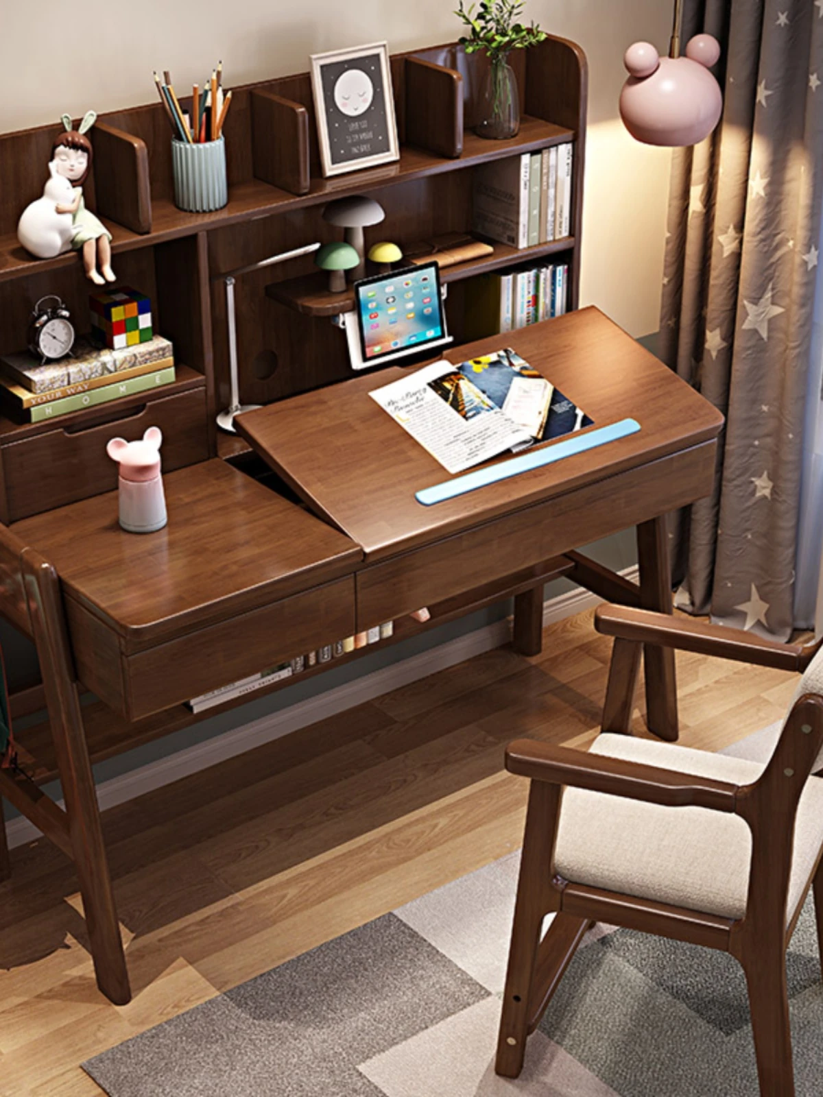 Elevate Your Learning Experience: Solid Wood Adjustable Desk and Bookshelf Combo Set - Kids' Nordic Study Table with Chair for Home Use, Perfect for Students!