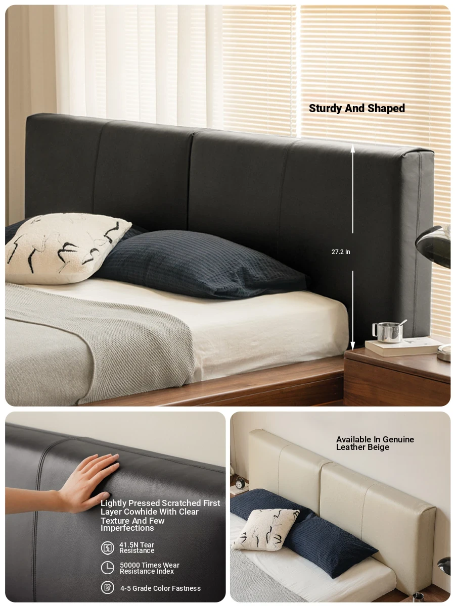 Genji Mu Yu Genuine Leather Bed - Cream Minimalist Design with Plush Elephant Ear Headboard for Home Master Bedroom - Perfect Double Bed for Comfort and Style