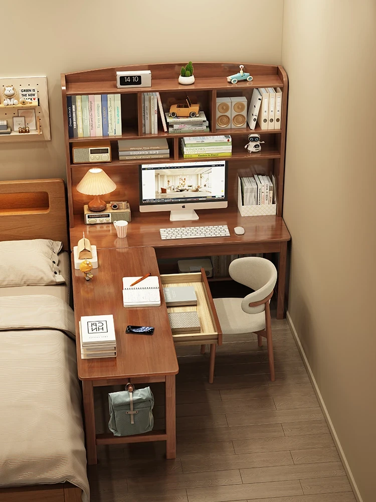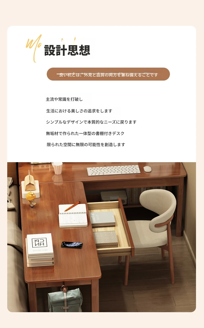 角にフィットする無垢材のパソコンデスク&ブックシェルフセット!おしゃれなL字型デザインで、限られたスペースを有効活用。快適な学習環境を提供する学生向けデスク&チェア一体型。