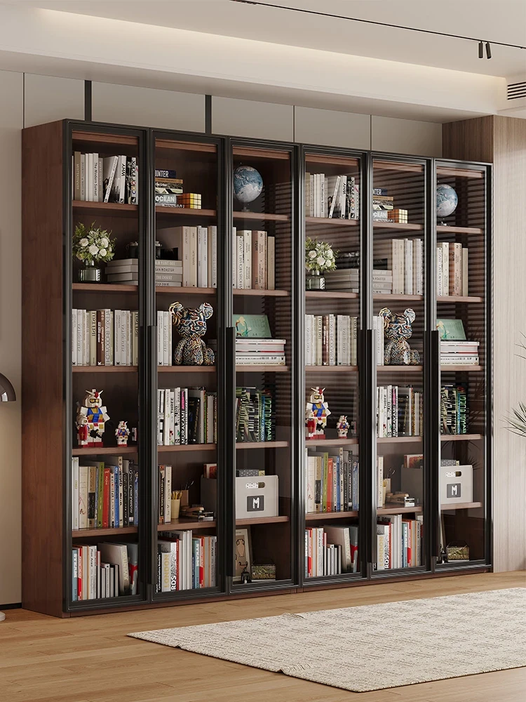 防塵・実木製の収納書棚|ガラス扉付きのモダン・シックなデザイン|リビングにぴったりなフロアスタンド展示キャビネット!収納力抜群、スタイリッシュな空間を演出します。