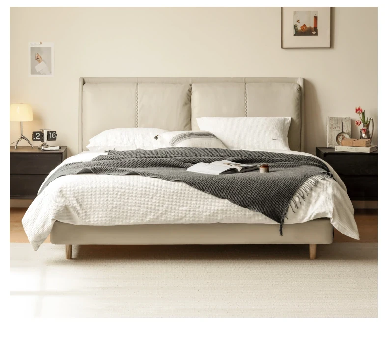源氏木语本革使用のクリーム色ベッド|スタイリッシュで高級感溢れる寝室家具|ラグジュアリーな羽毛ヘッドボード付きのダブルベッド