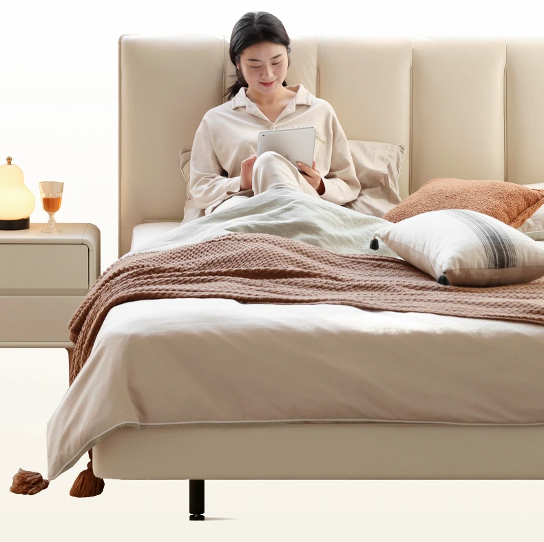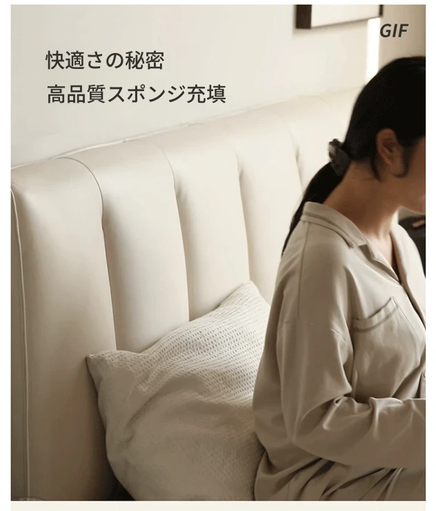 源氏木语の本革製ベッド - モダンでラグジュアリーなクリームカラーのダブルベッド。浮遊感のあるデザインで、ホワイトのソフトパッケージが魅力。心地よい眠りを提供します!