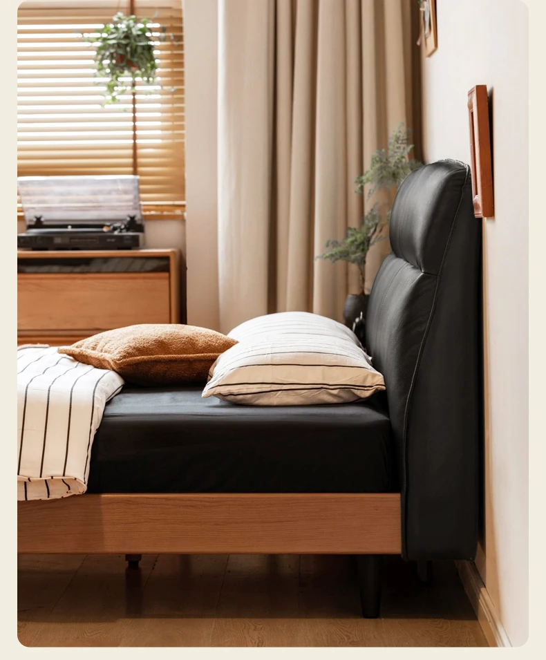 源氏木语 本物の無垢材 ソリッドチェリーウッド ブラック ダブルベッド ラグジュアリーな本革ソフトパッケージ ヘリボード 着浮デザイン 寝室家具の新たな魅力をあなたに!