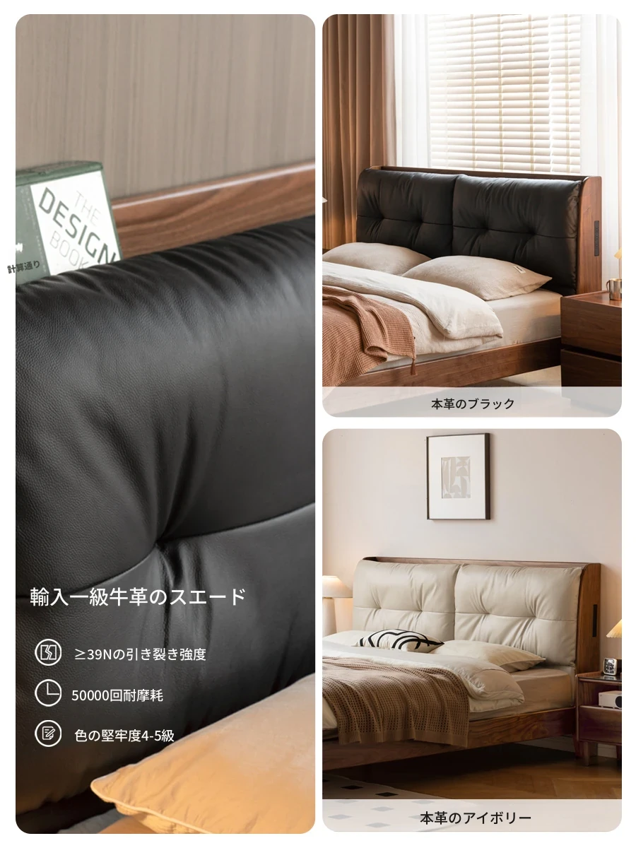 源氏木語の無垢材使用☆高級レザーソフトパッド付き☆シンプルなブラックウォールナットのダブルベッド☆贅沢なプライベート空間を演出するための理想的なホーム用ベッド