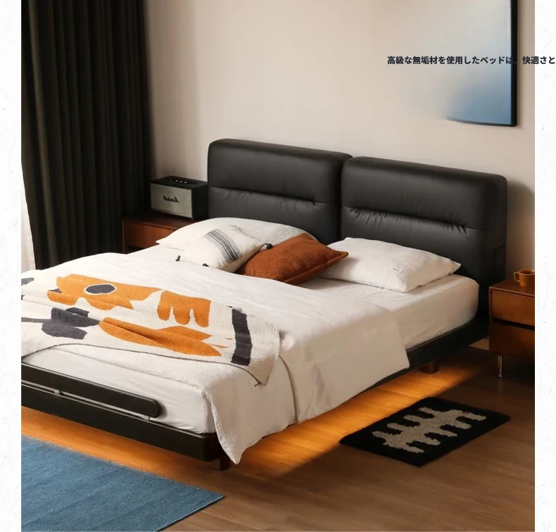 源氏木语 ブラックハウススタイル オーク無垢材ベッド ソフトバックレスト付き 主寝室用 ダブルベッド 浮遊感のあるデザイン 生活空間をオシャレに演出!