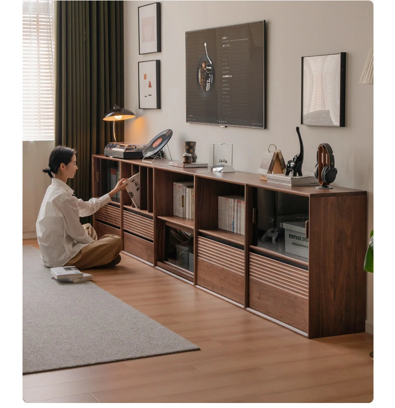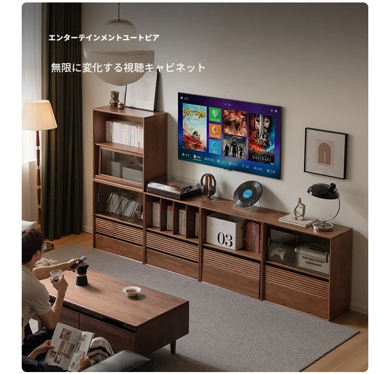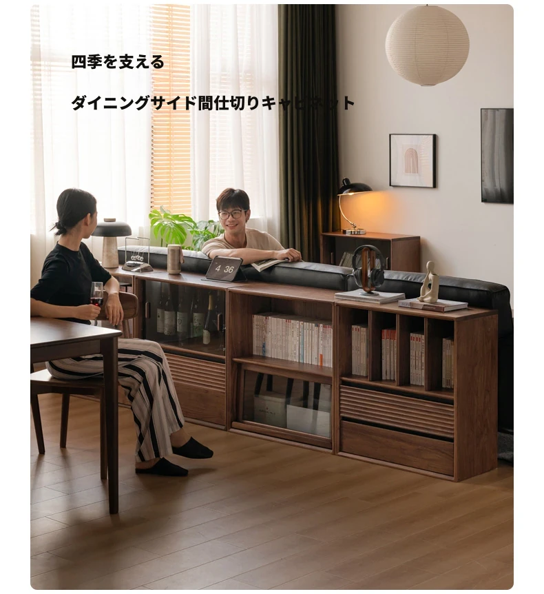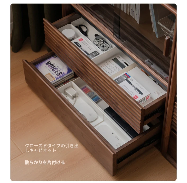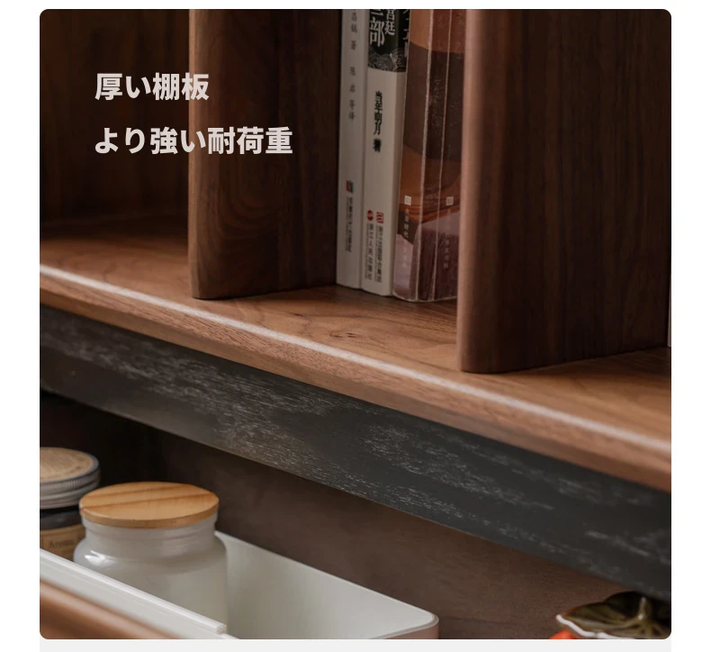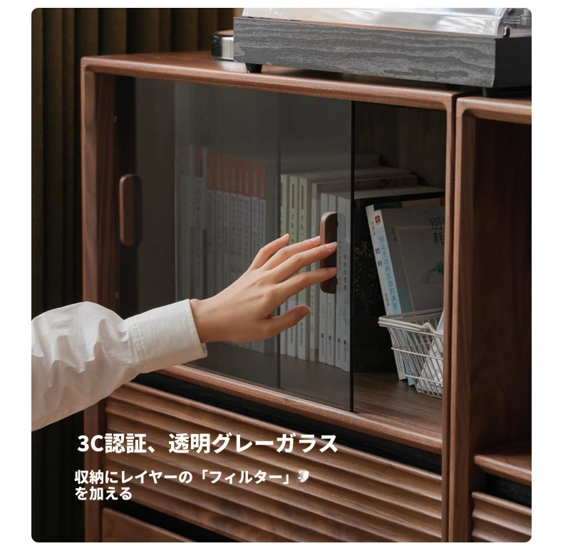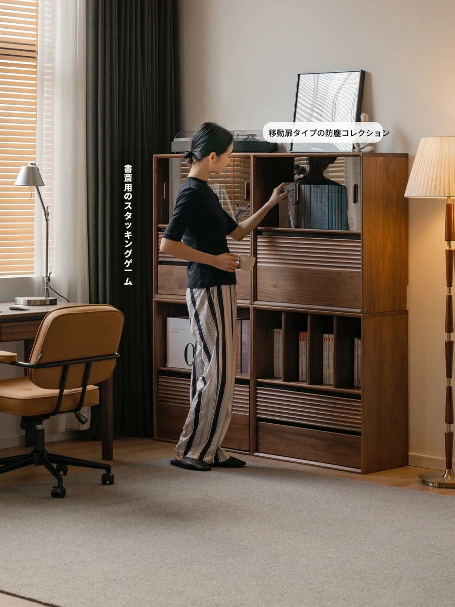 源氏木语の無垢材書棚|上質なナチュラルスタイルのモジュール式収納|ブラックウォルナット材使用|美しいガラス扉でおしゃれに整理整頓できる家庭用書庫
