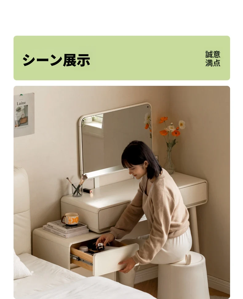 源氏木语のシンプルな無垢材ドレッサー|主寝室に最適なスライド式メイク台|クリームカラーのエレガントなデザイン|自宅用のホワイトキャビネット付き!