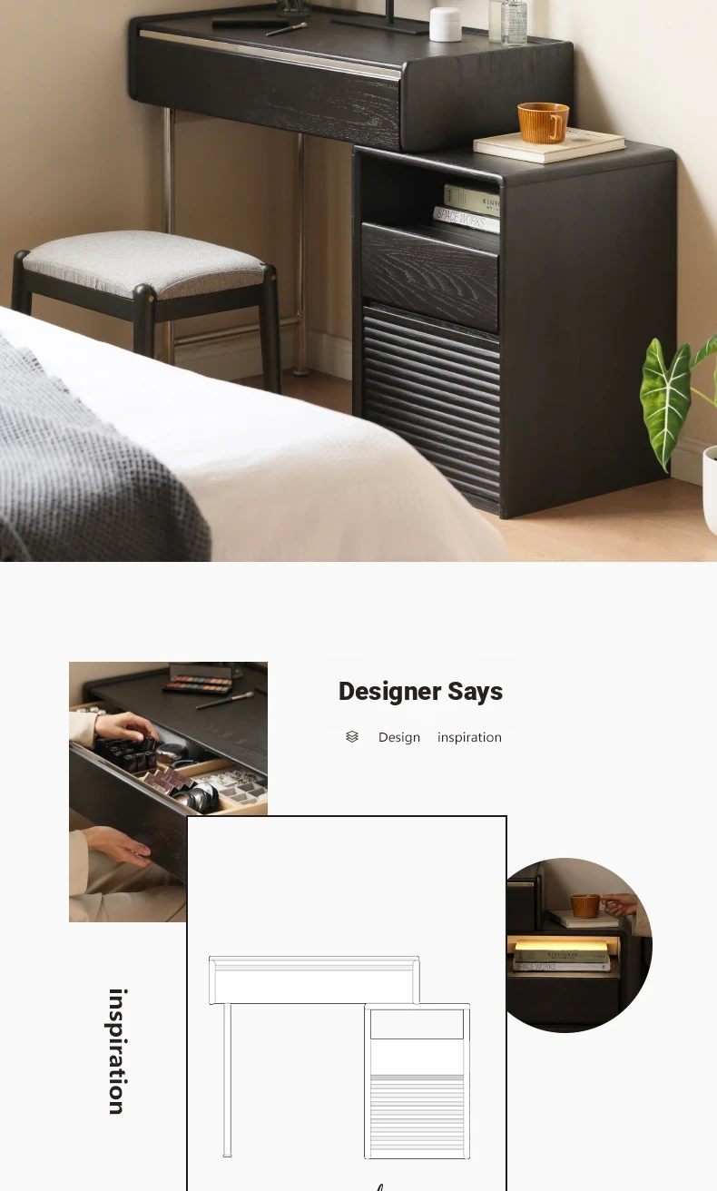 源氏木语 高級オーク材使用☆省スペース可変式 明るいLED照明付き シンプルなデザイン おしゃれな収納キャビネット付き ブラック化粧台 寝室にぴったりな美しさを演出!