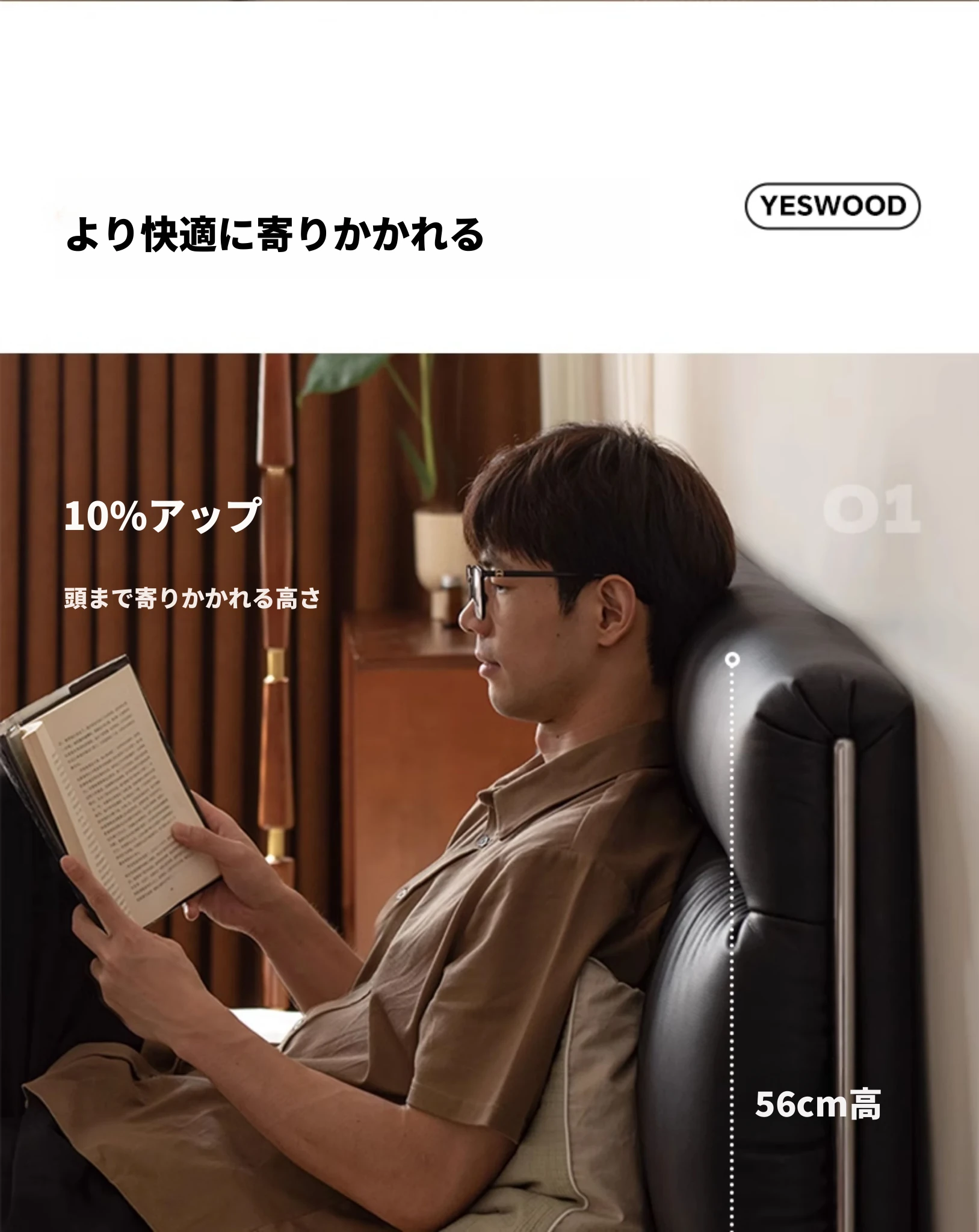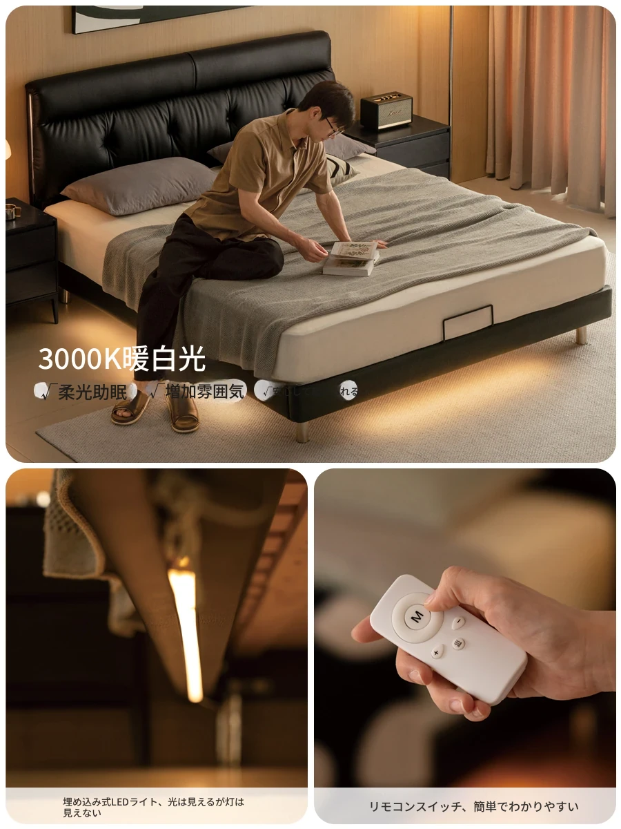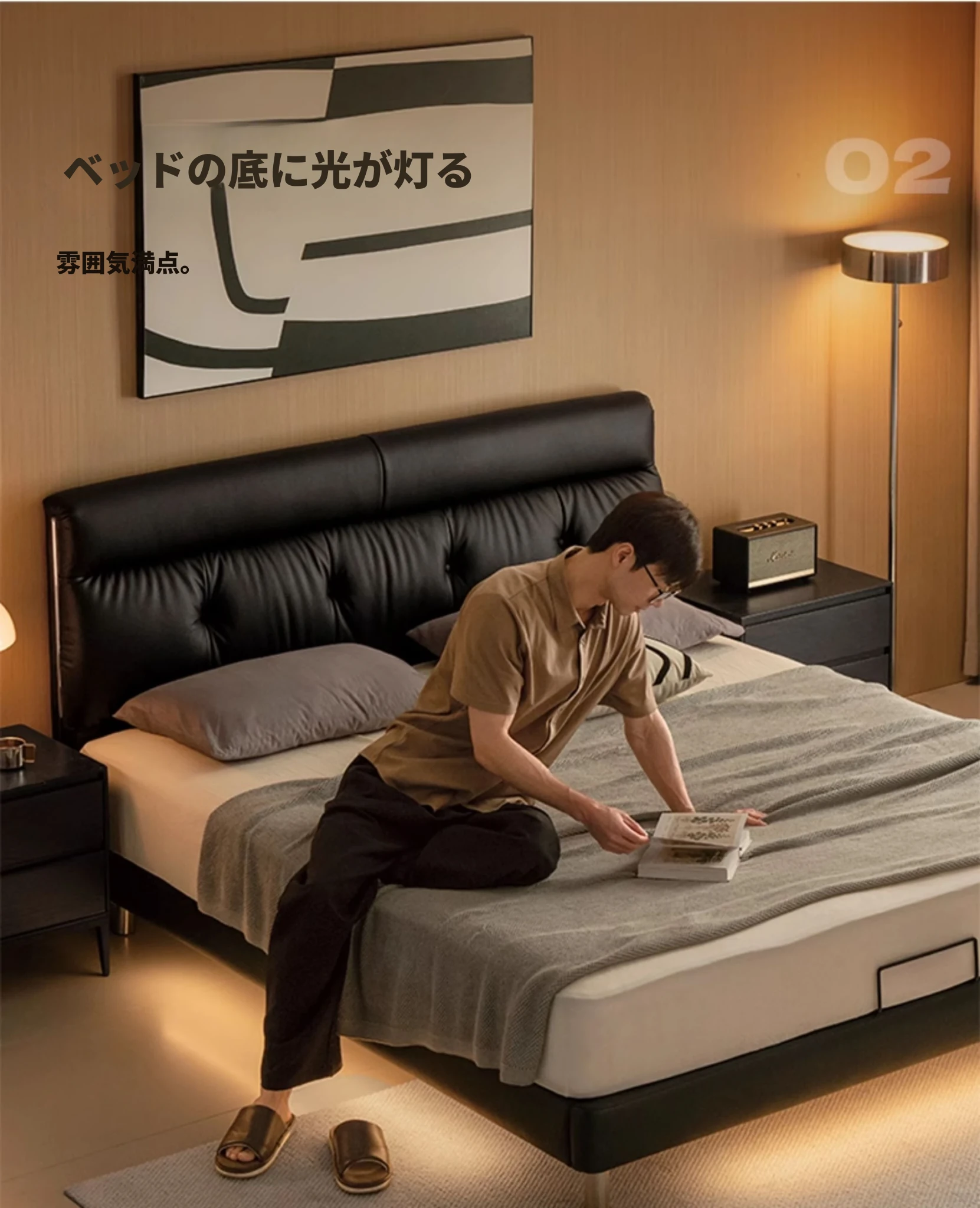 源氏木语の本革ベッド|モダンバウハウススタイルのブラックダブルベッド|照明付きソフトパネル|シンプルでスタイリッシュな家用ベッド眠りの質を向上させる快適空間!