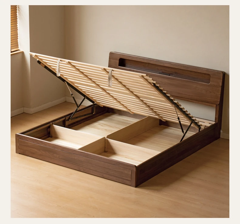 ゲンジムキジュウ 無垢材ボックスベッド モダンシンプルなブラックウォールナット ダブルベッド 北欧スタイルの気圧調整付きコンセント収納ベッド。快適でスタイリッシュな空間を実現!